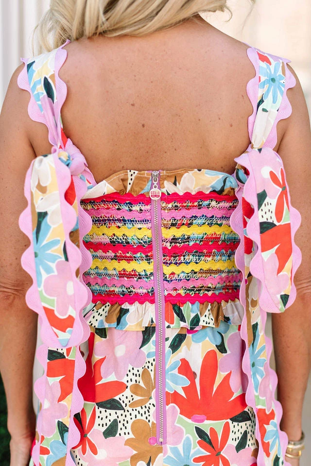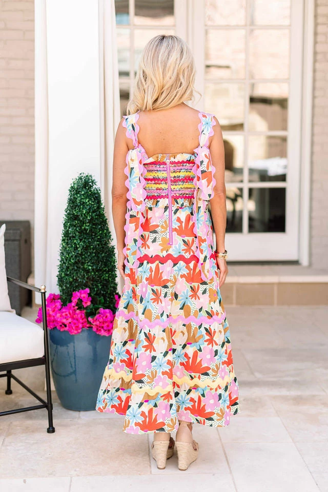 Our Cindy Dress is a high end piece that’s worth the splurge for the colorful, unique print, stunning ric-rac trim and flattering cut. The adjustable tie straps make for an easy fit and we love the smocked bodice with natural waistline. This piece is absolutely stunning in person and you’re sure to turn heads anytime you wear it. Go for it… you’re worth it!