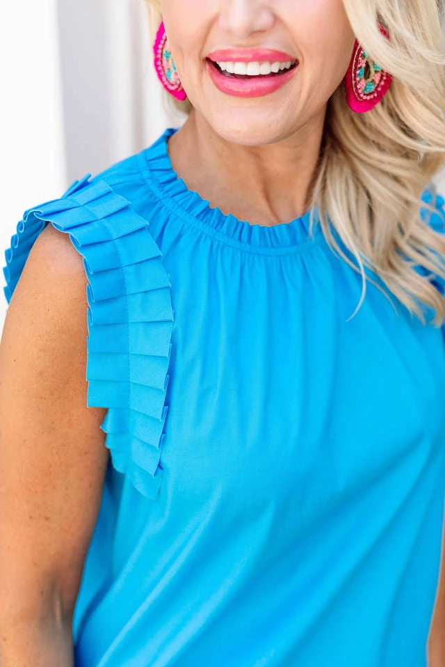Don’t wait on this one! Our Channing Top in Aqua is a crisp, poplin fabric with a stunning pleated detail trim. The classic and chic look makes it perfect for dressier occasions you have lined up this Summer! Easy to dress up or down- pair with white denim in the Summer and transition into Fall with darker wash jeans. Â