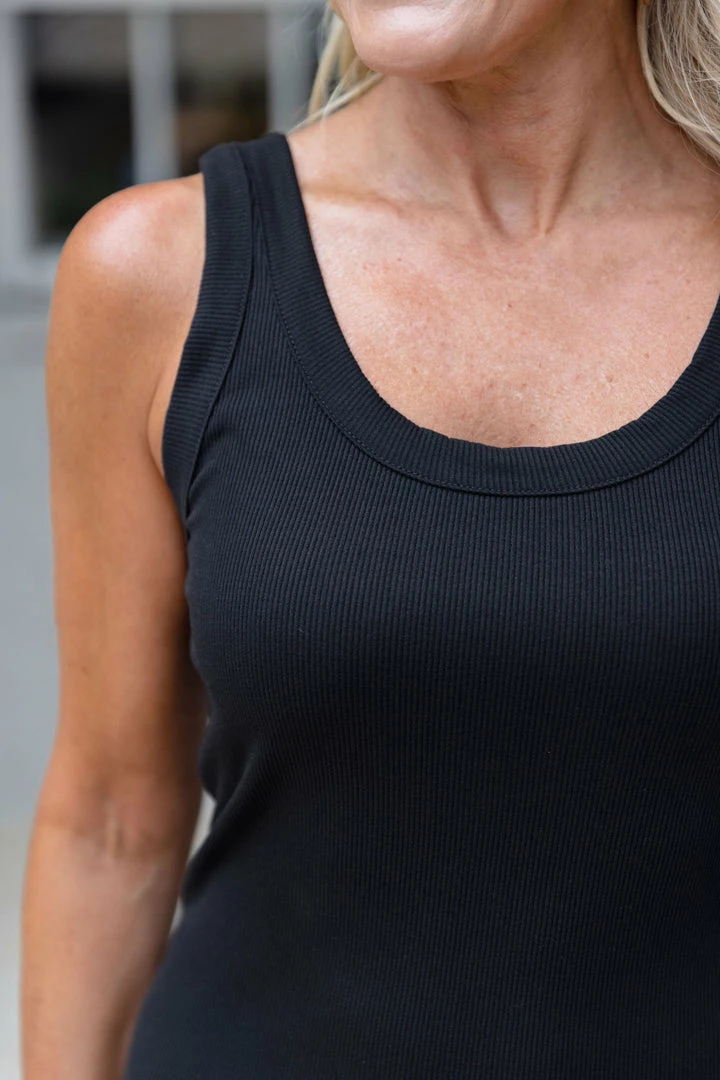 SUMMER ESSENTIAL! Our Brandi Dress in Black is the perfect tank dress for the warmer weather and the length is so chic. We love the lightweight ribbed fabrication and the subtle slit gives it the perfect touch for date night or fun with the girls! Pair with strappy heels or wedges for an on trend look! Also comes in Sand.Â