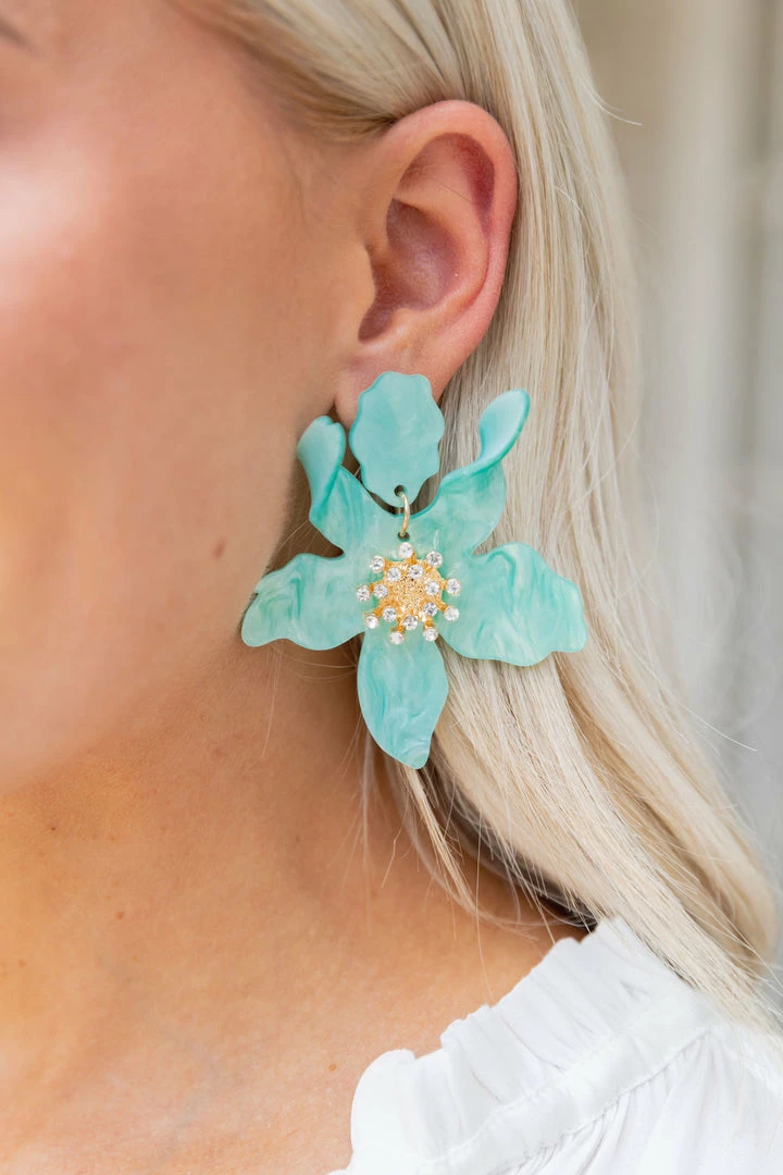 Ooo la la! Our Claudia Flower Earrings in Teal are so adorable in the flower design and rhinestones. Perfect to make a statement and spice up any outfit! Also comes in Pink and White.