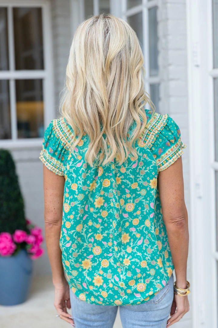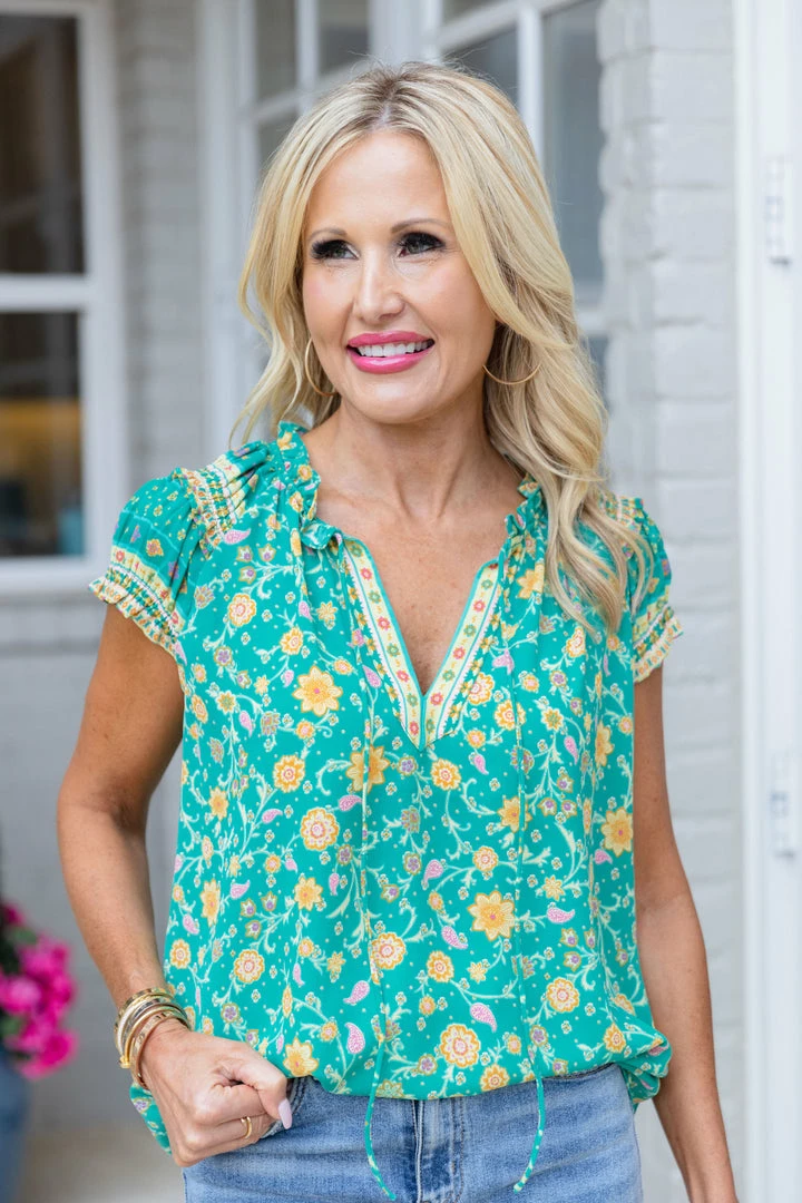 Instant add to cart!! Our Daphine Top by Current Air will be your new go to for a chic and lightweight piece for your tops collection this season. Constructed with ruffle detailing along the sleeve and this adorable green and yellow floral print – we can’t get enough! Pair with anything from cutoffs or white denim and wedges to complete the look.