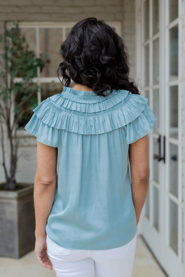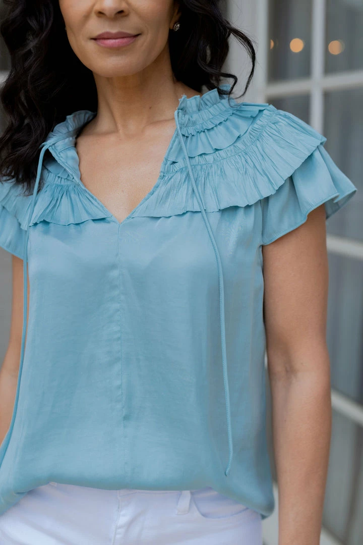 Fall in love with our Evelyn Top in Powder Blue by Current Air featuring a super lightweight fabrication, tie front closure, and ruffle sleeves. The structure of this piece makes for the perfect top to elevate your style this Summer! Pair with white denim and wedges for an on trend look. Also comes in Pink.Â