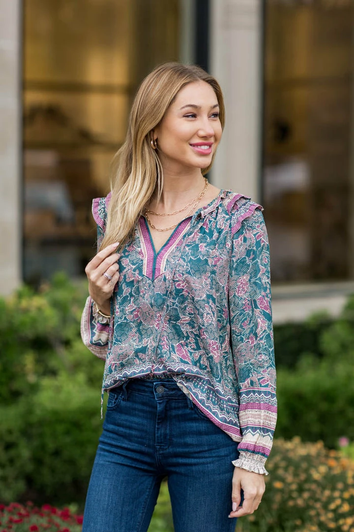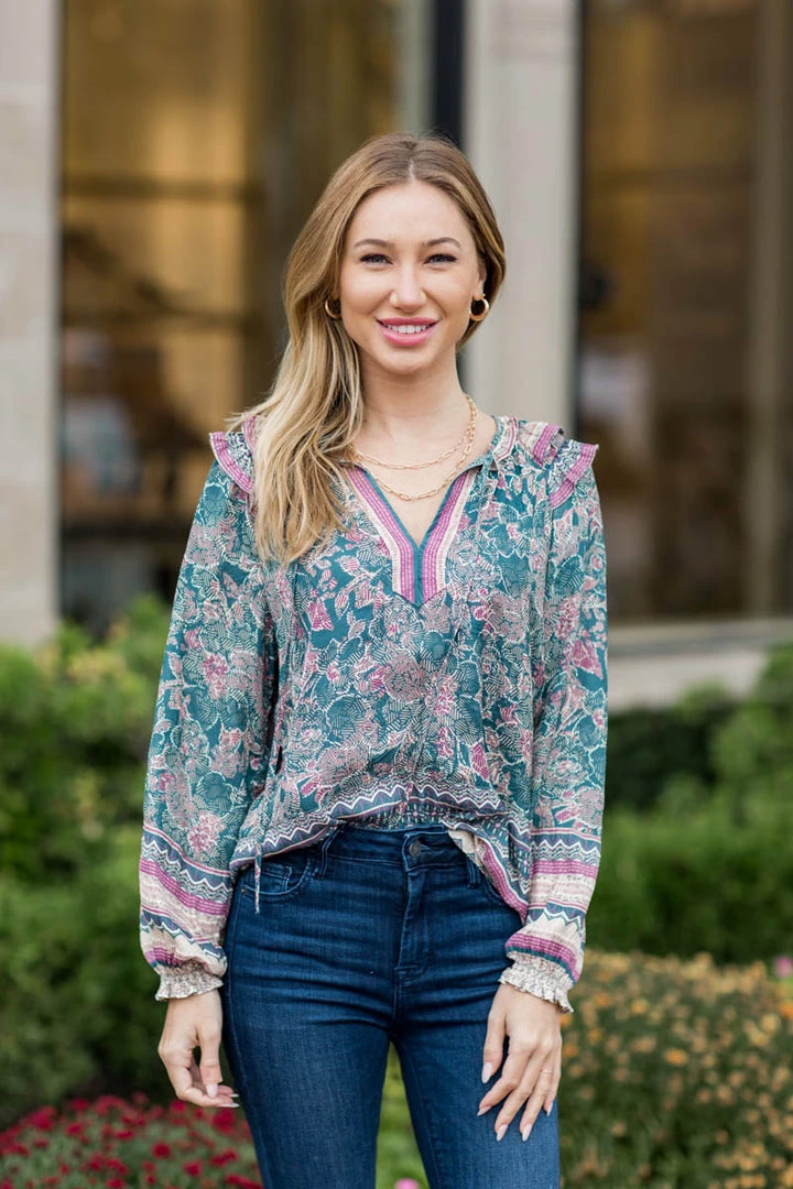 Our Laura Top by Current Air is a bit boho and all chic! This piece is gorgeous – from the pretty prints to the flattering silhouette with thoughtful details like the placket v-neck with front ties, ruffle detail on the shoulders and balloon sleeves. Pair with lighter wash denim in early Fall and transition to black jeans and booties come cooler weather. We can’t restock this piece, so don’t wait to snag it!