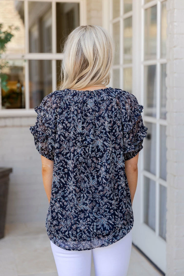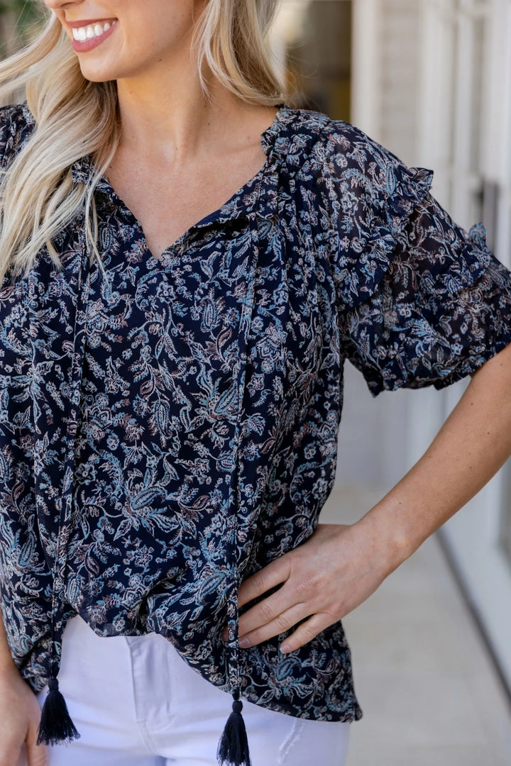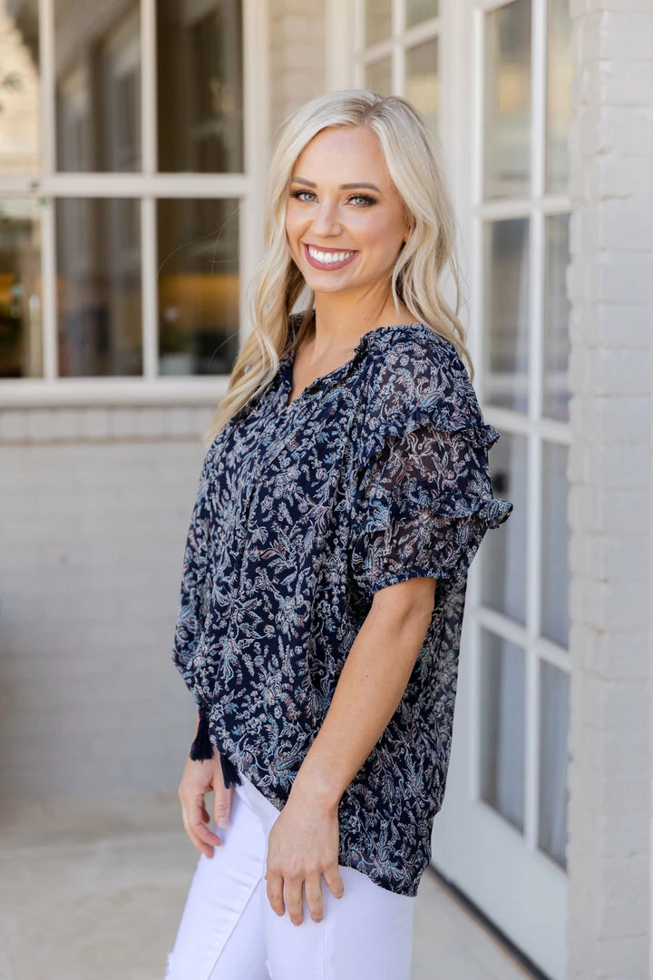 We’re obsessed with the structure of this piece! From the ruffle detailing on the sleeve to the tassel tie front tie, our Kamryn Top is the perfect lightweight navy paisley piece to add to your wardrobe this Summer. Pair with your favorite white denim and you’re ready for a family day or date night!Â