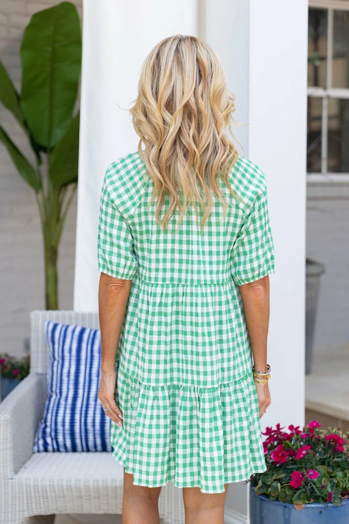 The Gabby Dress in Green by BB Dakota is an Avaraista favorite. Gingham is always a classic look for Spring and Summer and we love this colorful green version. The soft, lightweight fabrication is comfortable and talk about a figure flattering style – the v-neck, tiered ruffle styling is easy to wear and we love the sleeve length for a bit of arm coverage. Dress down with your favorite sneakers or pair with neutral sandals or platforms. Also available in Black.