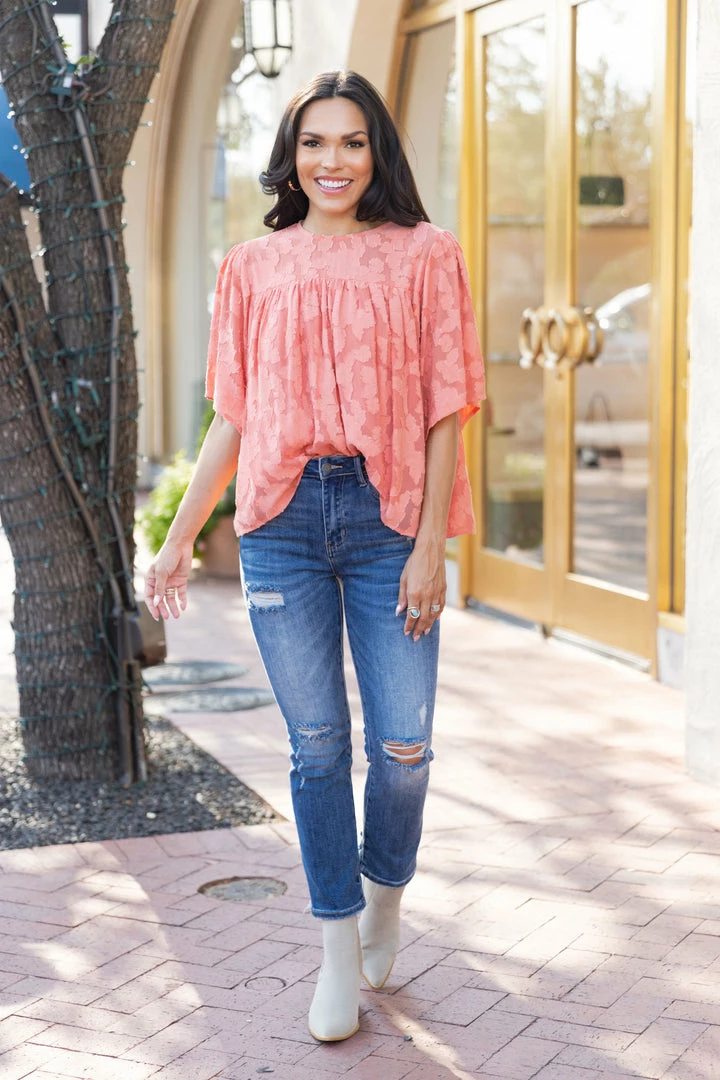 Pre-Fall fabulous! Our Gordana Top makes us long for walks in the pumpkin patch. The gorgeous muted orange color is elevated and pairs perfectly with denim. The layered sheer and opaque fabric adds dimension and the sleeves are the perfect length to provide just enough arm coverage. Pair with your favorite Avara denim and wedges or booties come cooler Fall temperatures.