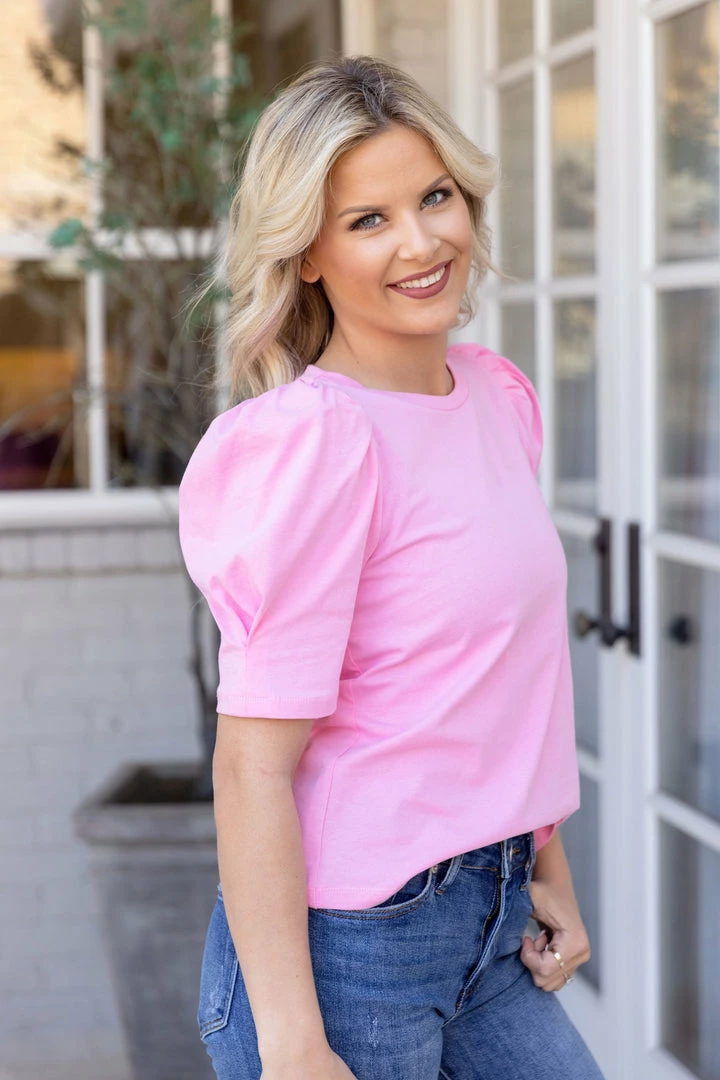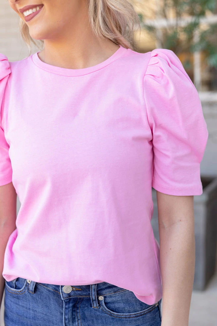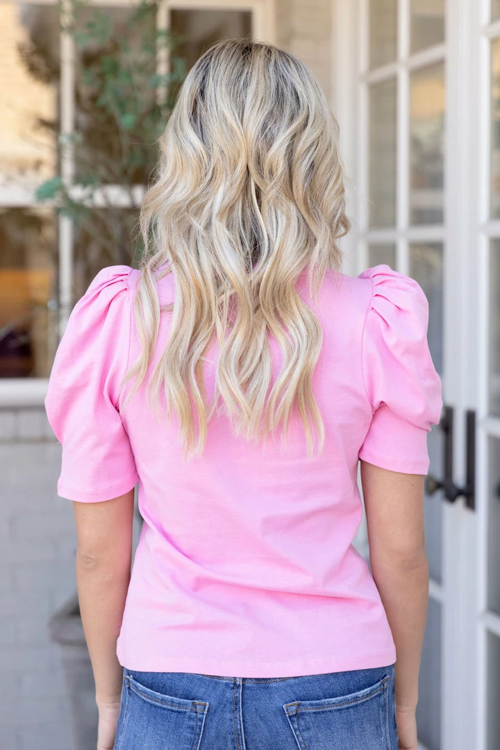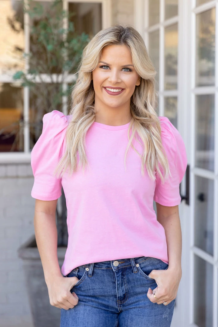 A fun twist to a basic tee! Our Taylor Top by English Factory is a lightweight, puff sleeve piece in a gorgeous bubble gum pink. A classic and comfy piece for running errands or an afternoon with your girls! Pair with your favorite denim and sneakers or dress it up with wedges!