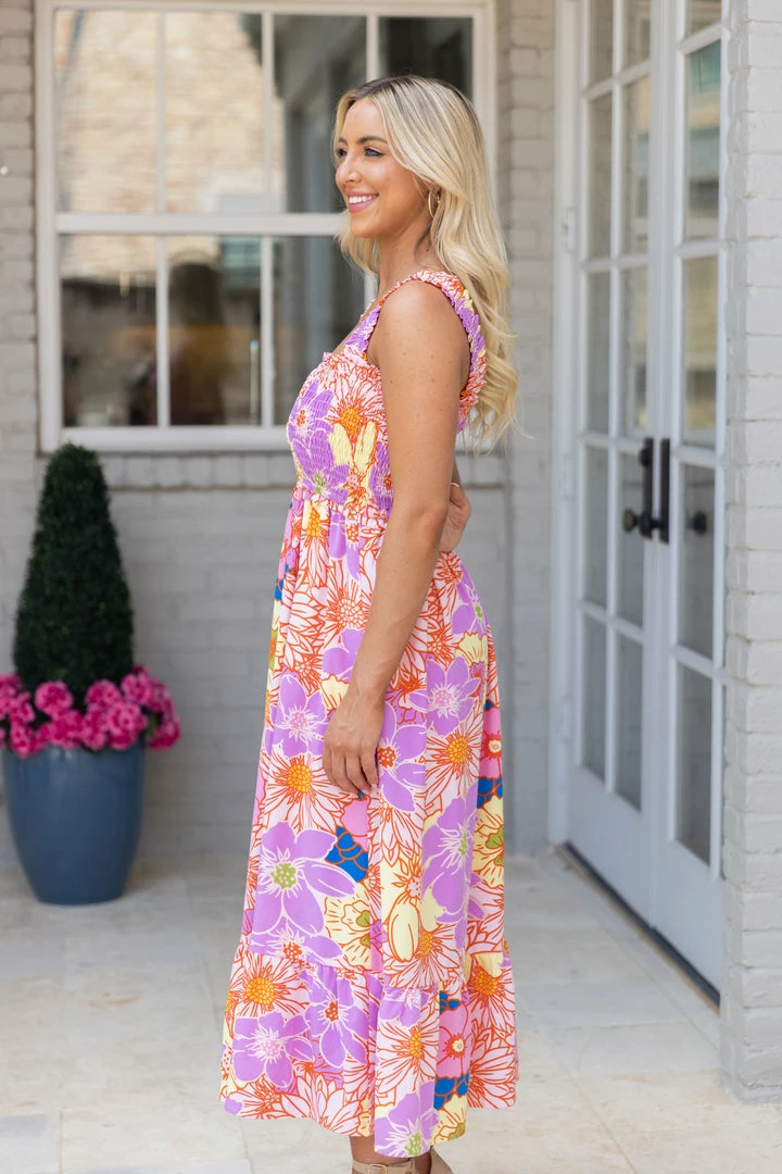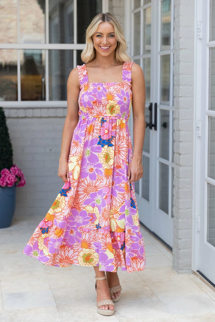 Our Polly Dress is a super soft and lightweight midi dress completed with a smocked bodice and smocked shoulders. We love the fun and bold floral print and can’t wait to wear this on our next vacation or running around town! Pair with wedges or sandals to complete the look.