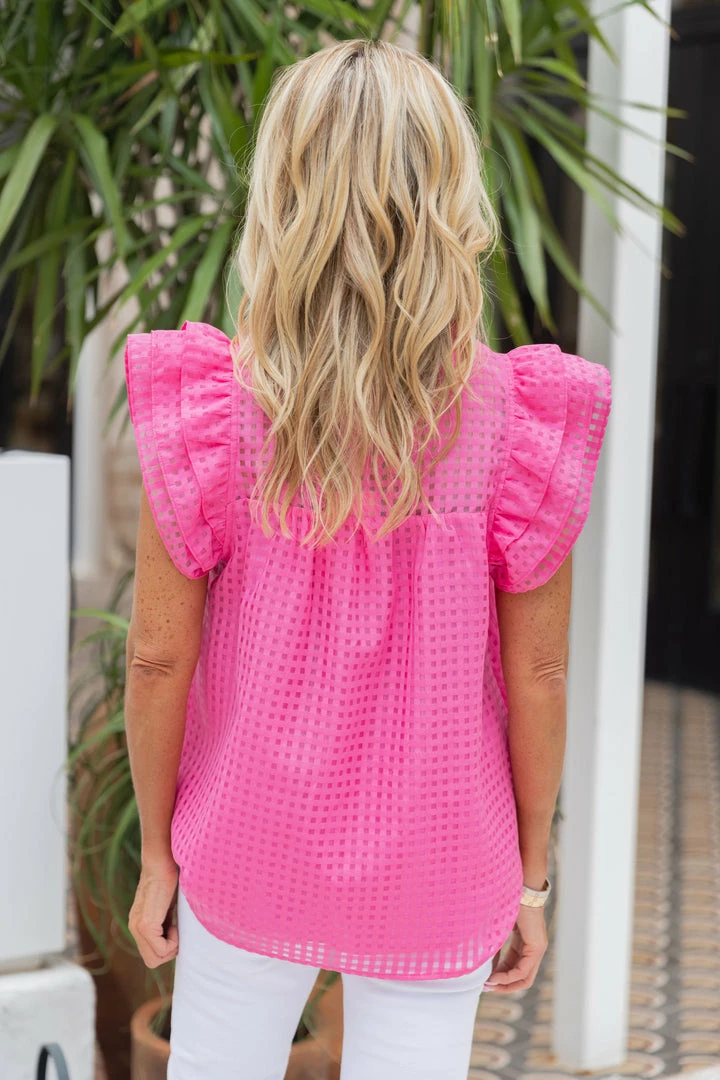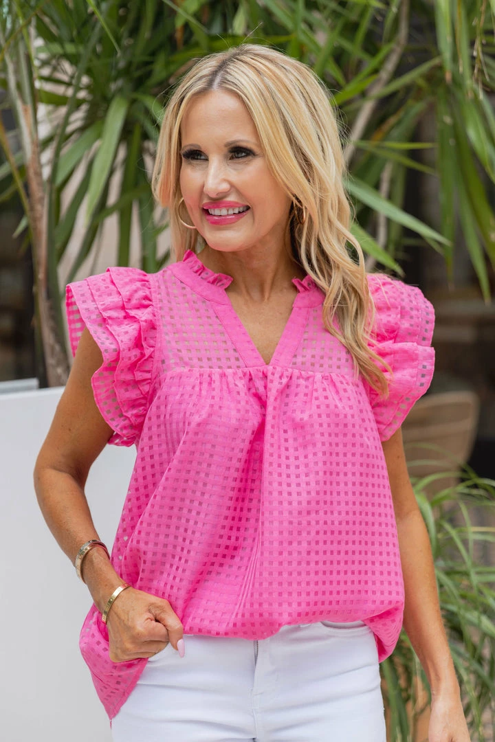 Staff favorite! Our Sofia Top in Pink is going to be a bestseller. We love the unique basketweave design, layered flutter sleeve, V-neckline and so much more! Top is fully lined with the exception of the top and back quarter. Perfect for those looking to spice up their wardrobe this season. Pair with denim with your favorite Avara sandals and you are ready to go! Also comes in Black and White.
