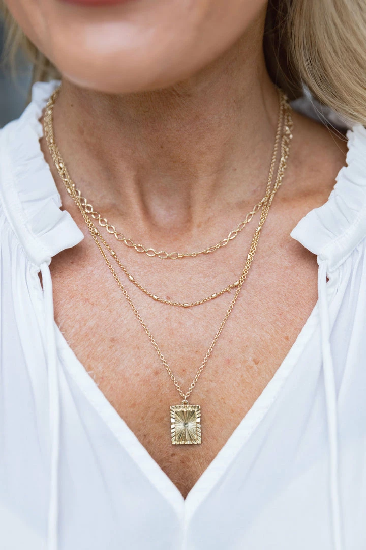 Gold layered accessories are so chic and classic and our Jennifer Necklace is no exception! The dainty chains and on-trend small pendant are the perfect touch for dressing up your favorite v-necks.