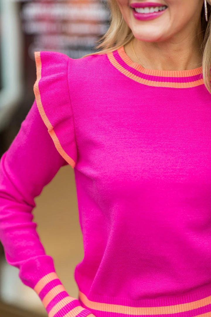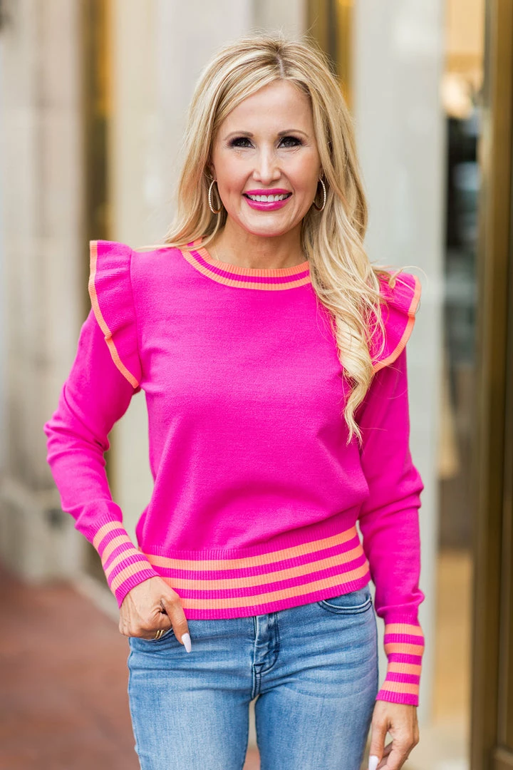 An Avara EXCLUSIVE! Our new Brenda Sweater is an add to cart no brainer. We love the feminine ruffles with contrasting ivory trim and fun stripes along the hem and cuffs. Wear with denim now or pair with black denim and boots when weather turns cooler. An everyday favorite that’s as cute as it is comfortable! This one’s a compliment magnet ladies and you can ONLY find it at Avara!