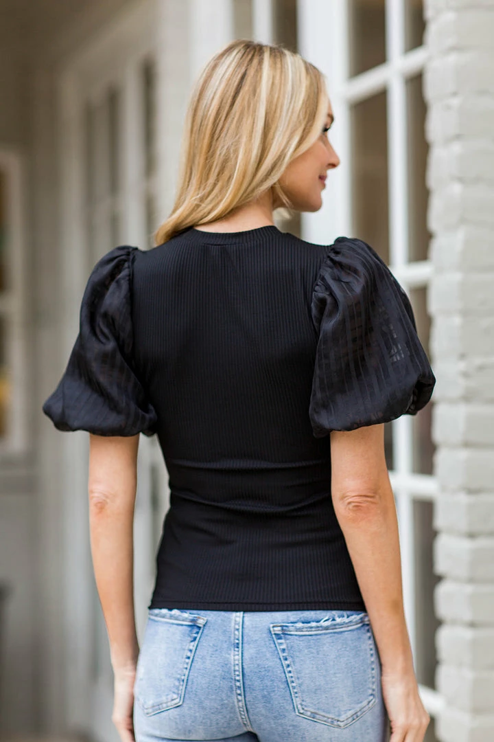 All about the details! Our Claudia Top in Black is a statement piece that’s chic AND comfortable. The lightweight, stretchy ribbed material pairs perfectly with the sheer puff sleeves with basketweave design. Make this piece standout with light wash or white denim and complete the look with wedges or strappy sandals. Also comes in Blush.Â