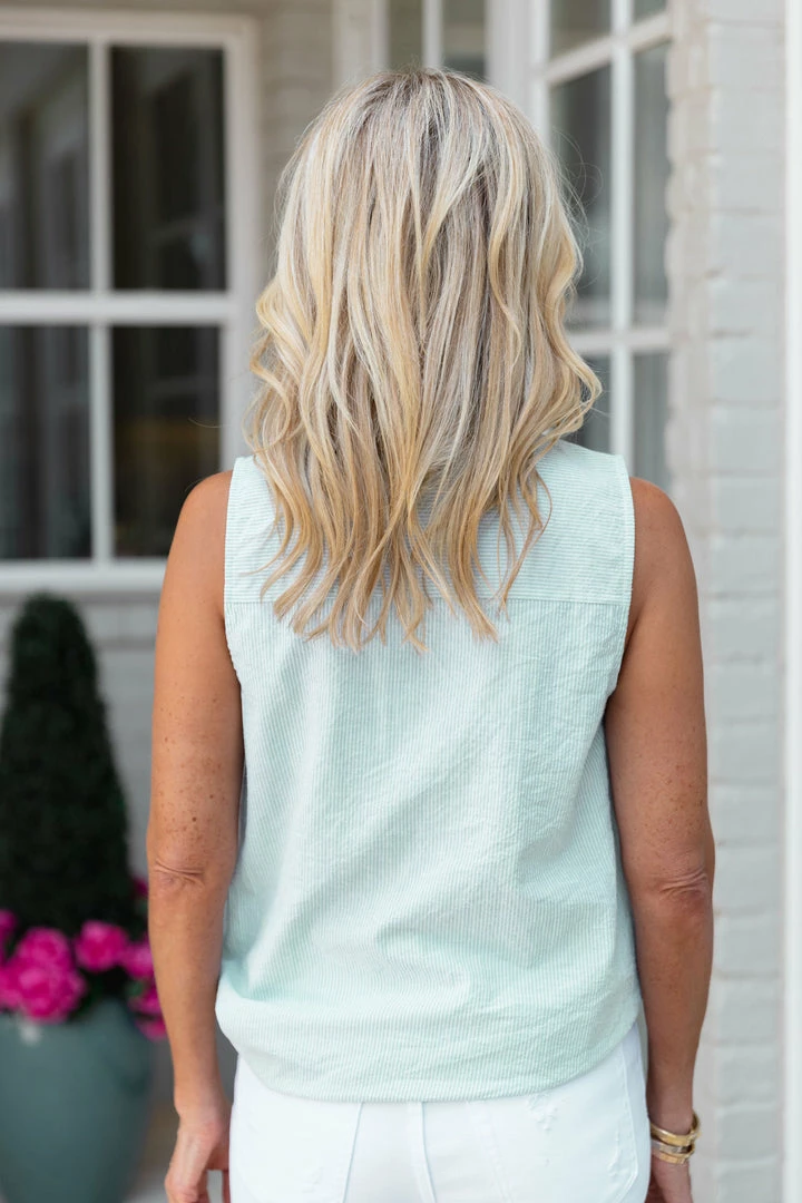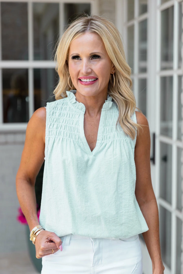 Simple and chic! Our Elyse Top in Green is the lightweight piece you NEED to beat the heat this Summer. The flattering v-neck with smocked bodice is easy to wear and the lightweight seersucker-like fabric is classic cute. Pair with your favorite white denim and espadrilles or dress down with denim cutoffs and sneakers. Also comes in Pink.