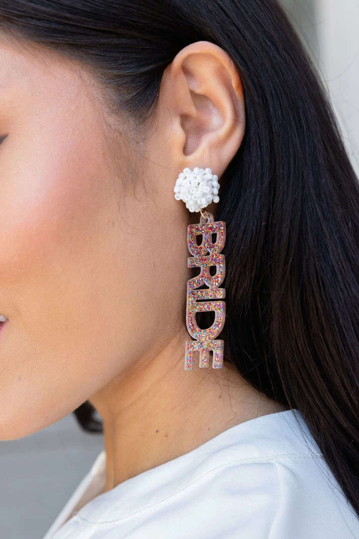 Calling all Brides! Our new Bride Earrings in Multicolor with pearl cluster tops are an absolute must have for our ladies getting ready to walk down the aisle. The perfect addition to a bachelorette party, shower or anything in between! Also comes in Silver.
