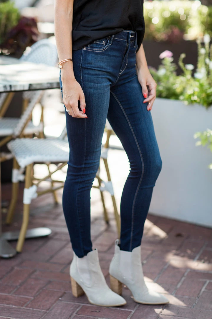 The Freda Jeans could be our new favorites for everyday! These dark rinse jeans with raw hem are incredibly comfortable with great stretch. The higher mid-rise gives them great support that’s oh so flattering – they actually give you a butt! We love the raw hem that’s cute, casual and perfect to pair with sneakers or dress up with strappy neutral sandals or boots.