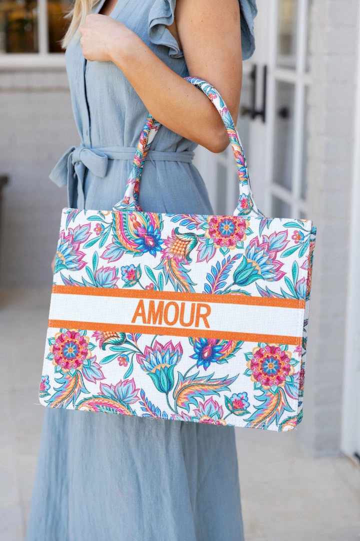 We love finding colorful accessories for the Summer and our Amour Tropical Tote in Orange is no exception! This fun but sturdy bag is perfect for taking on vacation or every day life. Throw your laptop and notebook in there and you are ready for the day! Bag does have a top zipper enclosure.