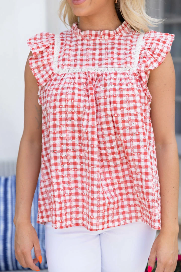Sweet and feminine! Our Adalyn Top in Gingham Red is so classic for the season and we can’t wait to wear this piece! From the flutter sleeves, floral eyelet embroidery, and gingham print – this will be your new go to for all your summertime events. Pair with classic white denim and sandals for a compliment worthy look!