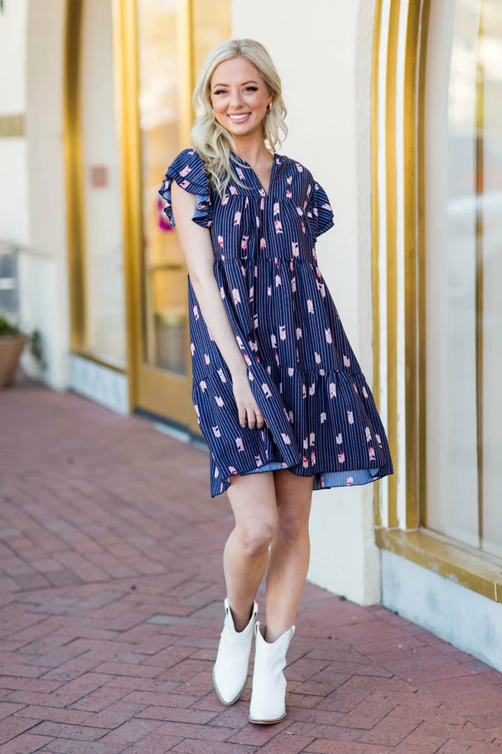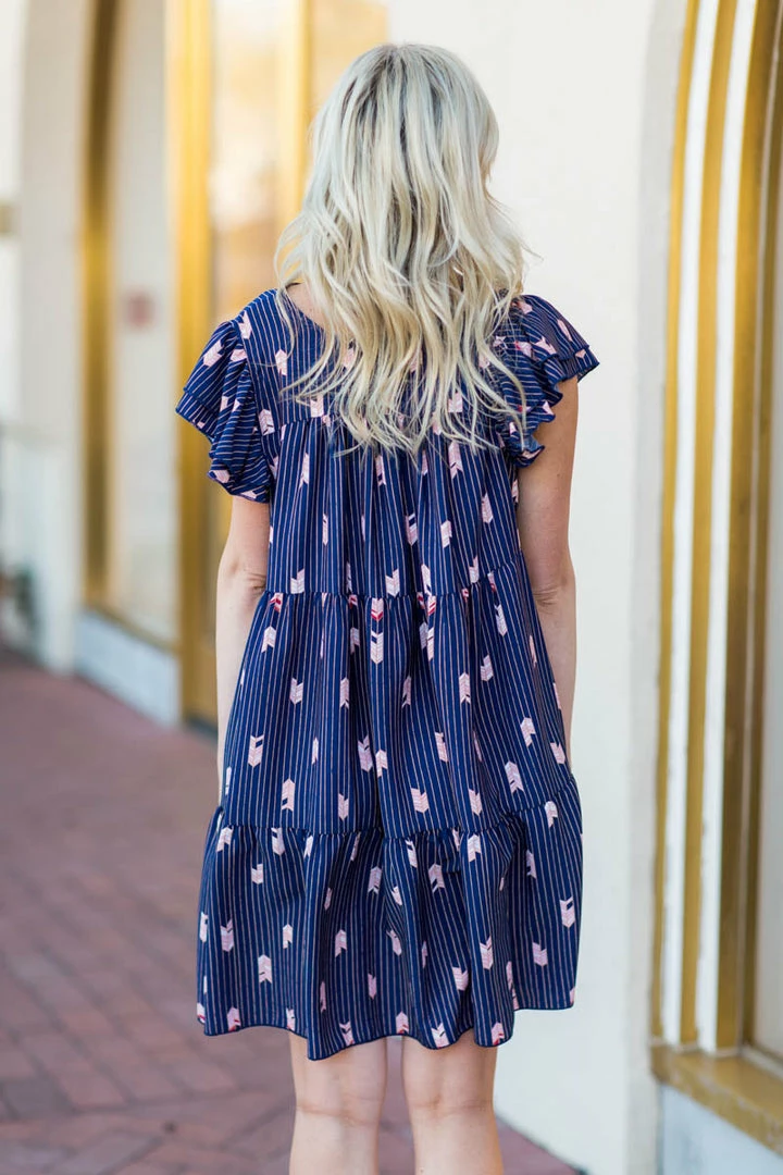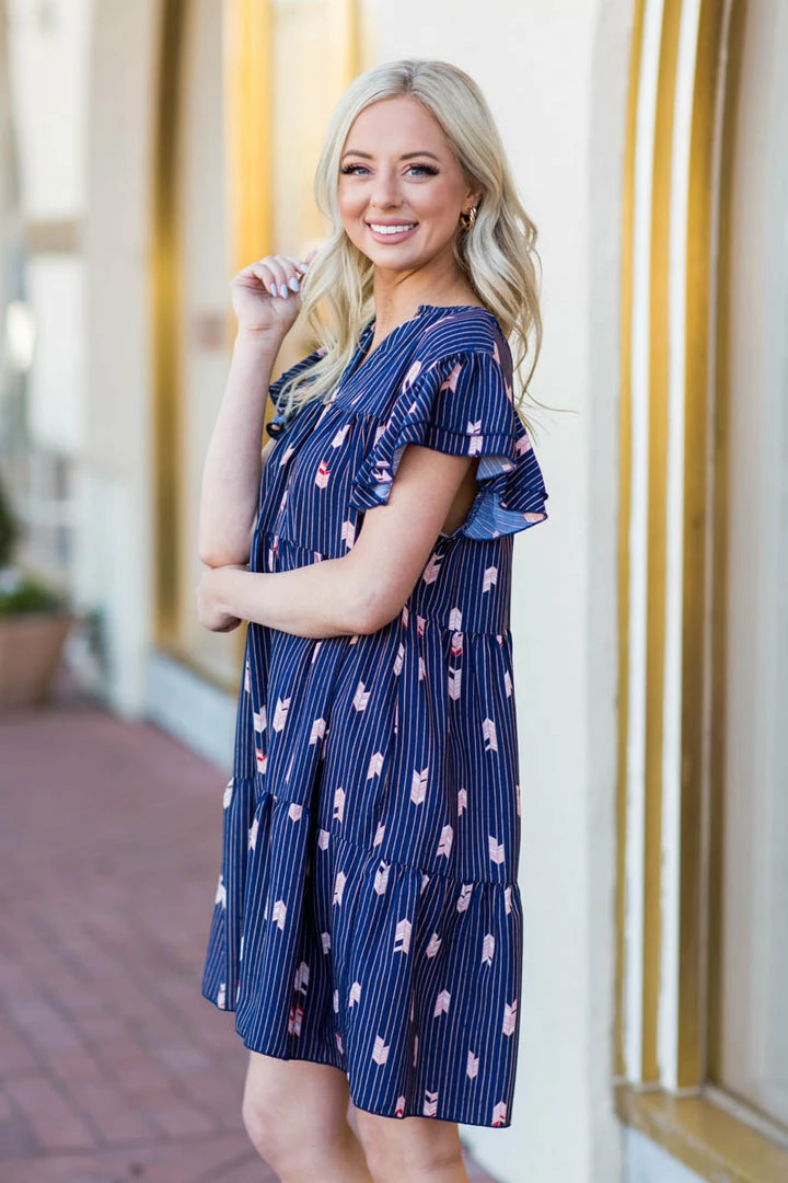 Our Elizabeth Dress is picture perfect! With lightweight fabrication, layered flutter sleeves, navy coloring, a subtle v neck, tiered detailing and stripe and arrow design, you can’t go wrong purchasing this fun piece! This piece is Spring Break ready and perfect for hitting the beach with friends and family. Pair it with a sunhat and some strappy sandals and you’re ready to go!