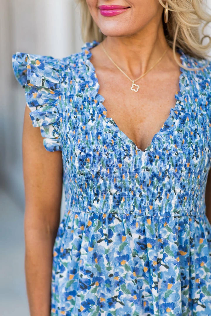 Feminine perfection! Our Rana Dress will be your go to for all your events this Spring and Summer. We love the gorgeous blue floral tones, smocked bodice and flutter sleeves. Feel like a million bucks in this dress without the expensive price tag. Pair with your favorite wedges or sandals. Don’t wait on this one ladies, it won’t last long!