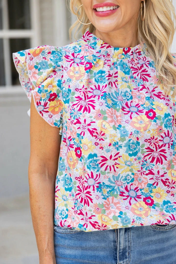 THESE COLORS! Our Ashley Top adds a gorgeous pop of color to your Summer wardrobe. We absolutely love this colorful, yet elevated floral print and the piece is as flattering as it is easy to wear – the lightweight fabrication is perfect for the Summer heat. A versatile piece that can be paired now with white shorts or denim and transitioned into Fall with your favorite jeans. At $48, this piece is an add to cart no brainer!