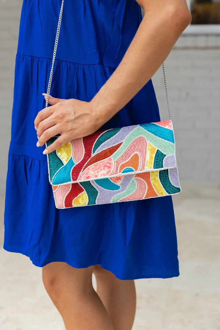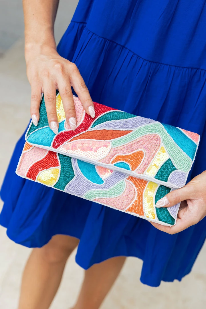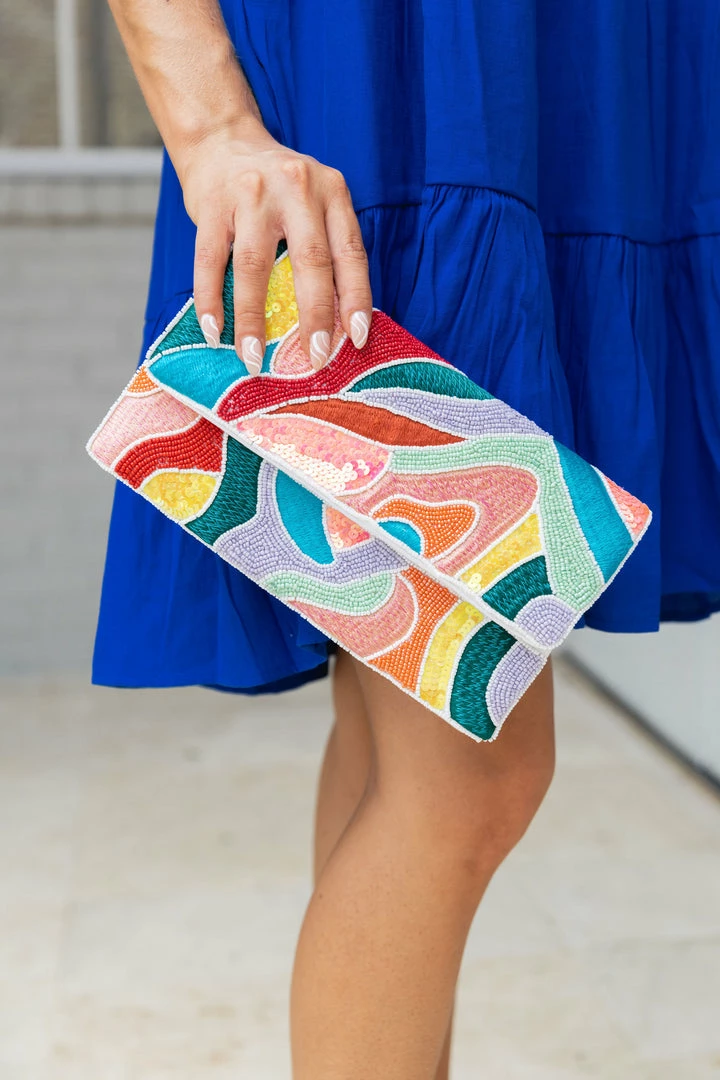 OBSESSED! Our Allie Beaded Clutch is so much fun from the bold colors to the beading, sequins, and stitching details! Add it to your collection!