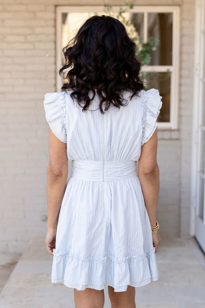 Sweet and feminine! Our Bruno Dress is a lightweight soft baby blue striped fabric with flutter sleeves and a ruffled hemline. This darling piece is perfect for brunches or casual evenings this season. We love the band at the waist to really hold you in. Pair with wedges and dainty jewelry to complete the look!