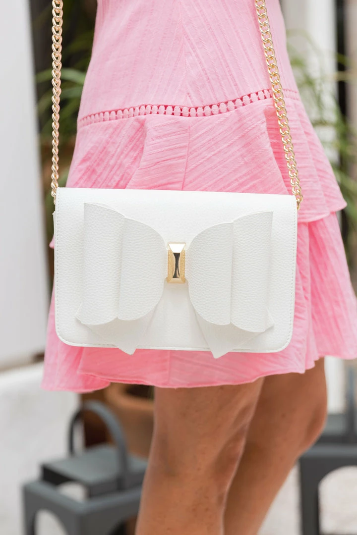 A statement bag you’ll wear all year long! Our Cassie Bow Bag in White is so gorgeous and chic with the gold chain strap, adorable white bow, and magnetic closure! Also comes in Beige and Black.Â