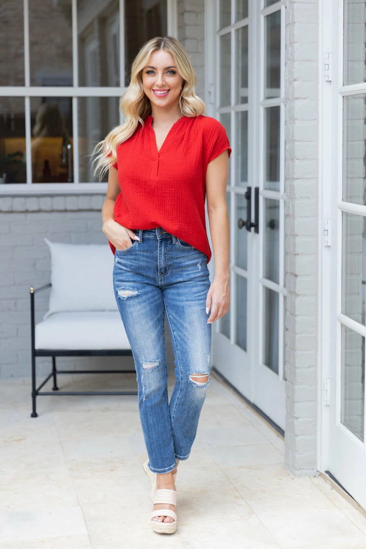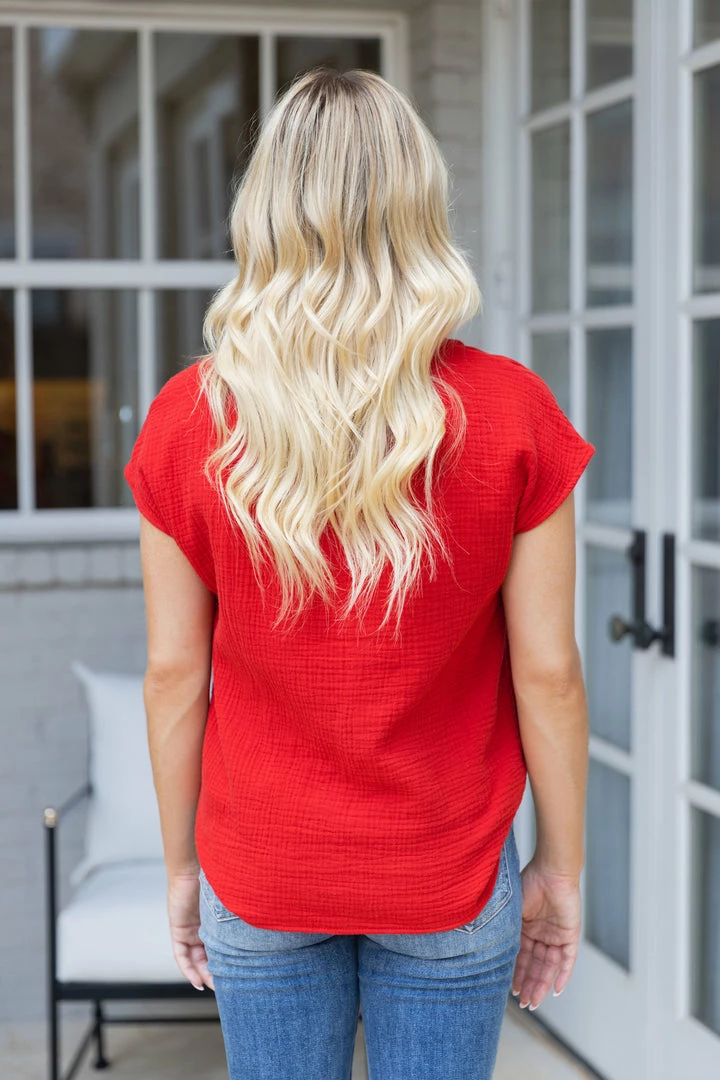 This gorgeous shade is the perfect pop of color! Our Miley Top in Red is a lightweight, cotton gauze material completed with a mandarin collar and capped sleeves. The perfect transitional piece to pair with white cutoffs or jeans. Add to cart before it’s gone ladies! Also comes in White and Blue.