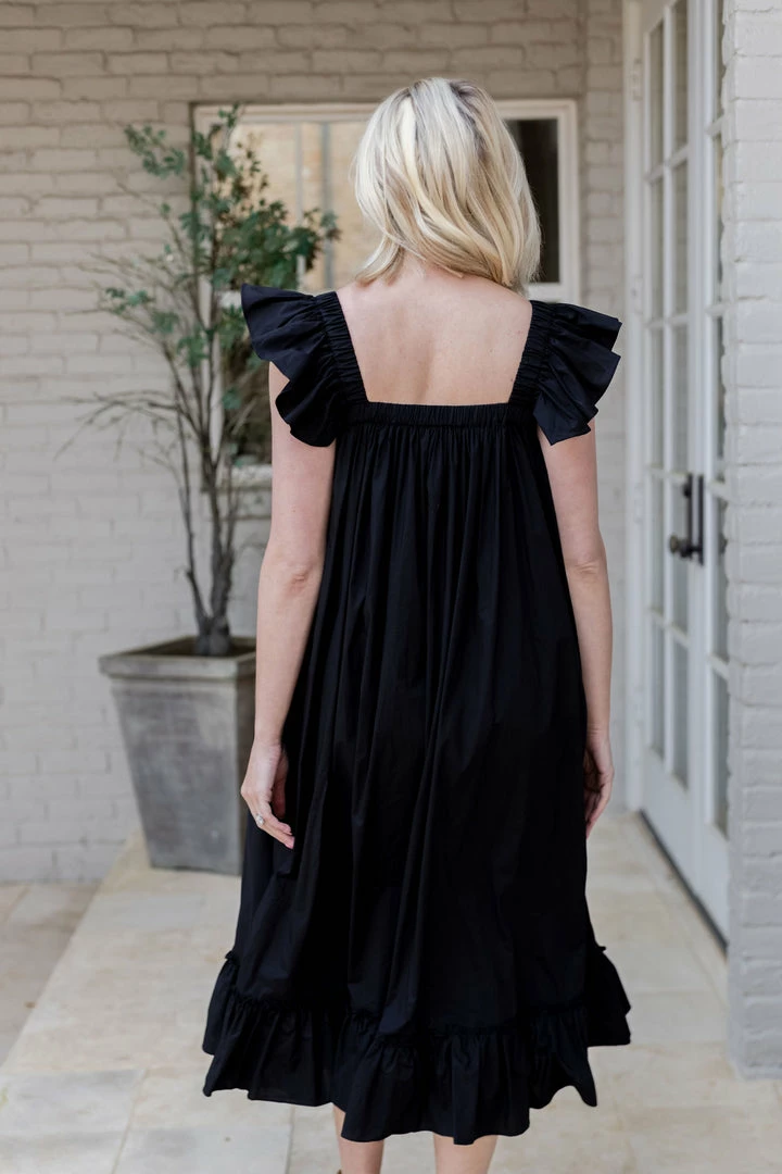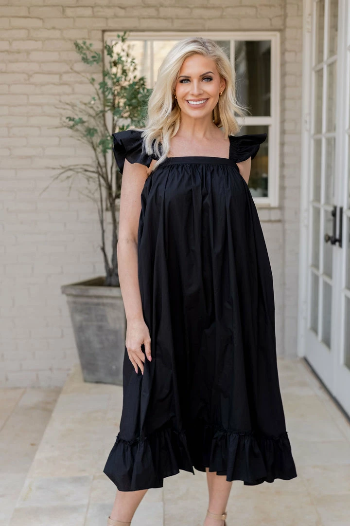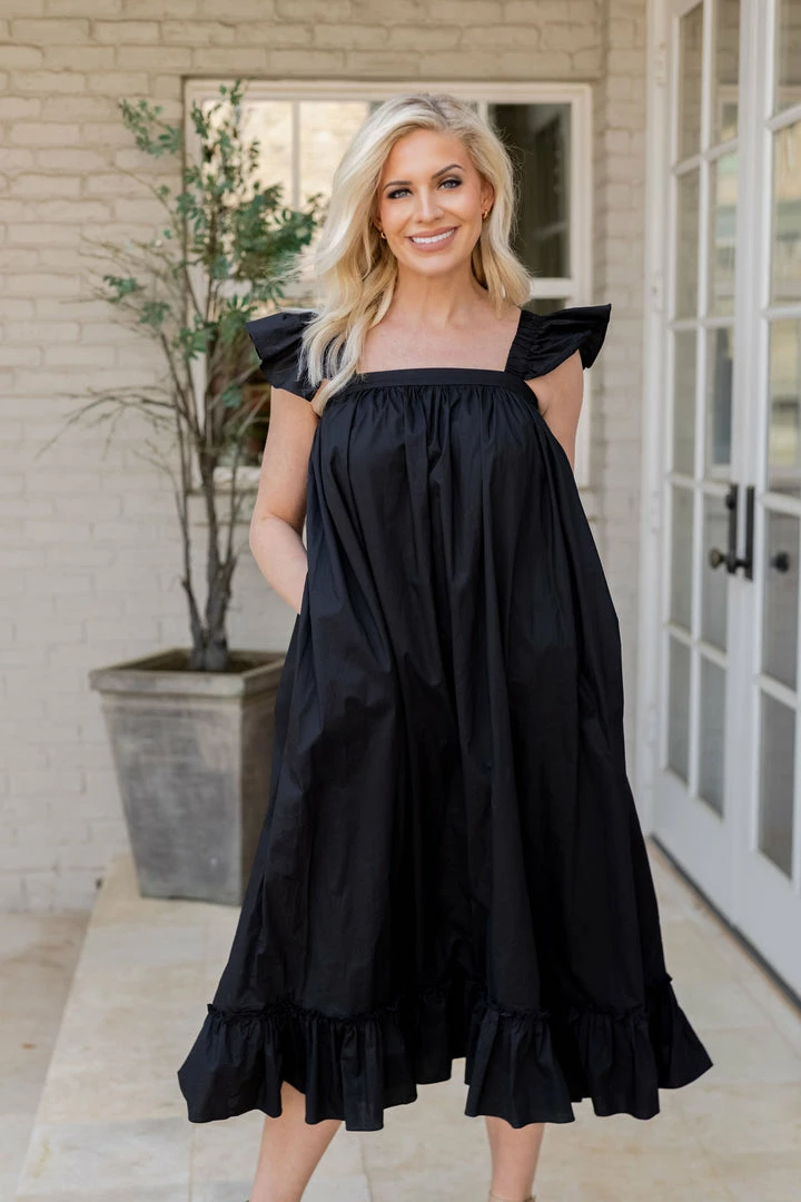OBSESSED! The brand new Jessica Dress in Black is as good as it gets! The babydoll style is comfortable and casual while the ruffle sleeves and buttons down the back are romantic and feminine. The linen-like material (that doesn’t wrinkle!) is comfortable and adds an expensive feel. The basic black will pair perfectly with all your favorite accessories and shoes, and it gives you the chance to add pops of color! Also available in Tan.