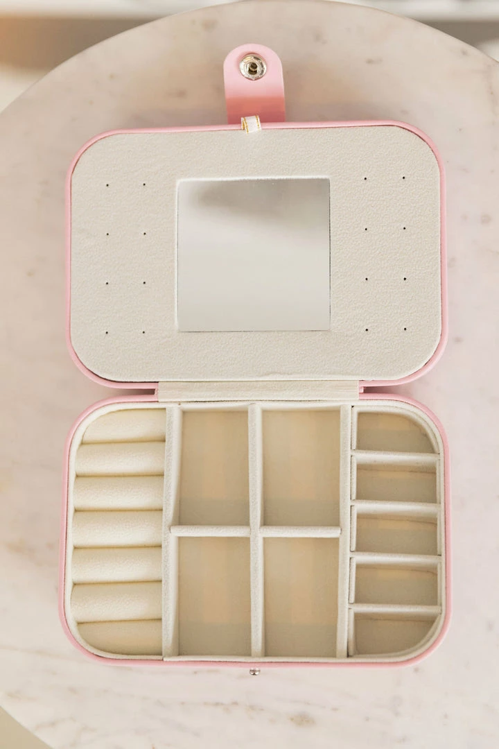 Take our Harlow Jewelry Case in Pink anywhere you go! The compact size and easy organizers for earrings, necklaces, and rings is so convenient for travel or keeping safe at home! Also comes in Turquoise.Â