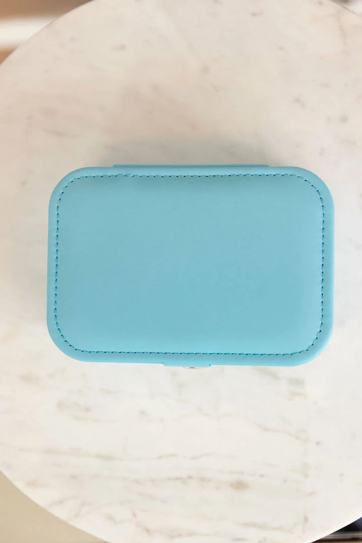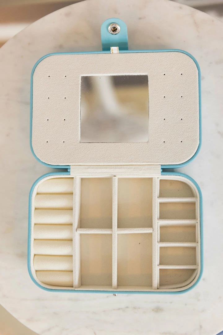 Take our Harlow Jewelry Case in Turquoise anywhere you go! The compact size and easy organizers for earrings, necklaces, and rings is so convenient for travel or keeping safe at home! Also comes in White.