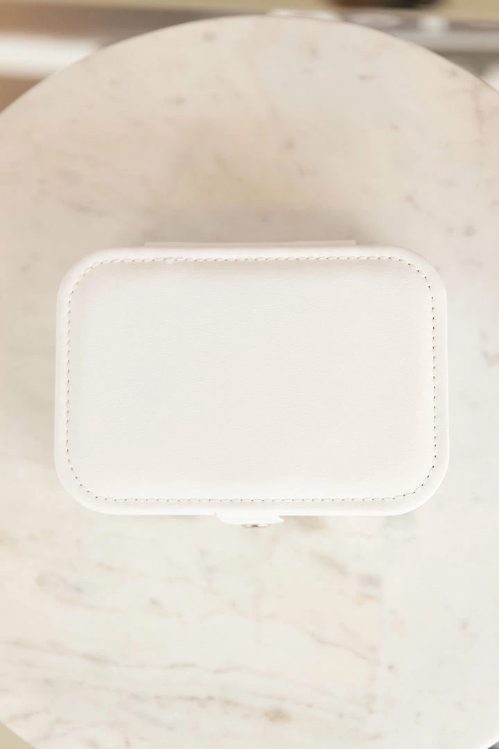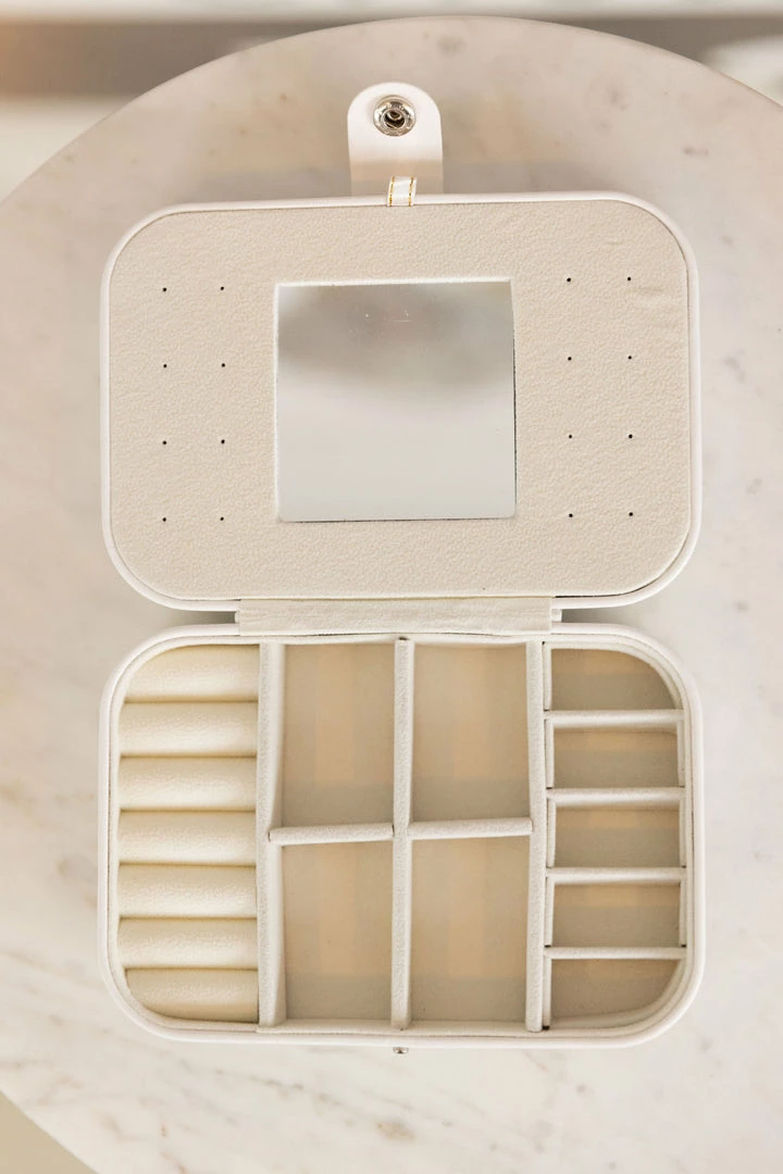 Take our Harlow Jewelry Case in White anywhere you go! The compact size and easy organizers for earrings, necklaces, and rings is so convenient for travel or keeping safe at home! Also comes in Turquoise.Â