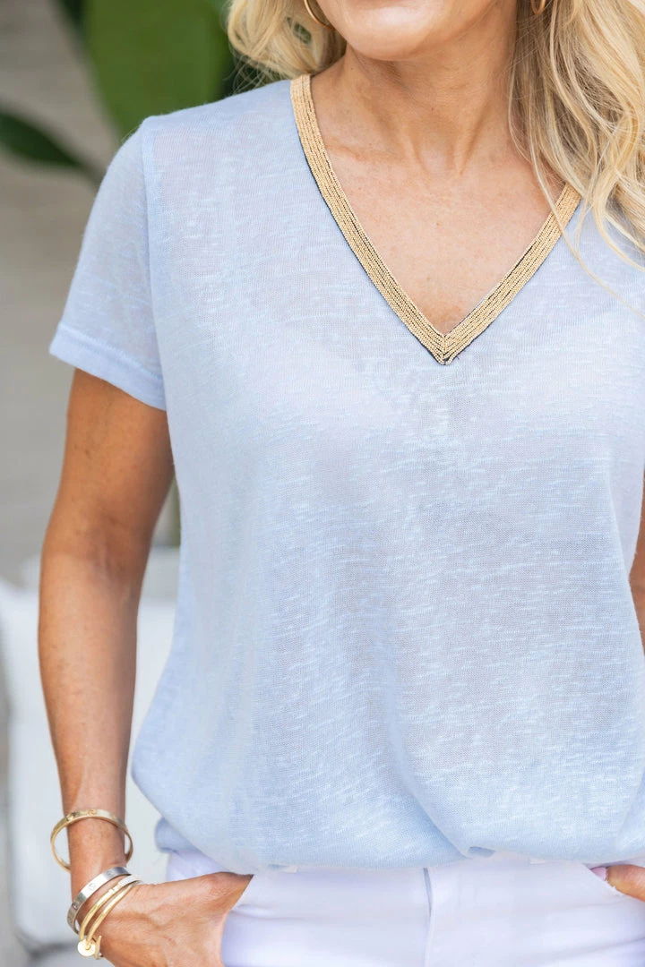 A basic tee with the sweetest details! Our Juliet Top is a lightweight fabric with a slight sheen and gold trim v neckline. This piece is perfect for days you need something to throw on and be out the door, but still feel chic and trendy. Pair with white denim or cutoffs and you’re ready to go!