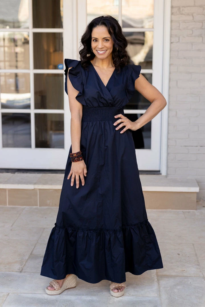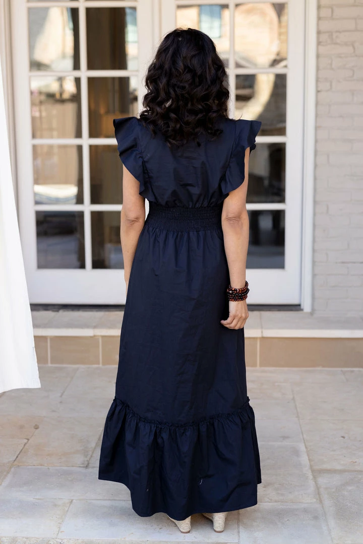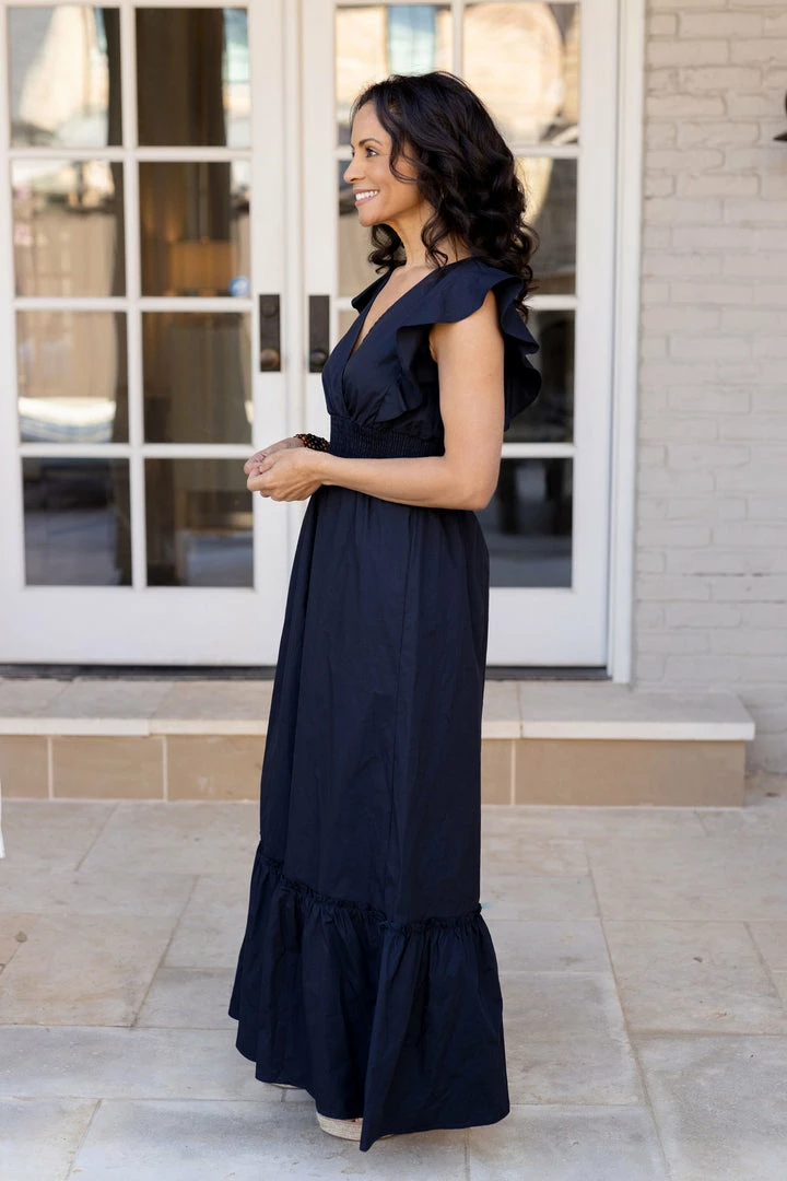 BRAND BESTSELLER! Our Melanie Dress in Black is a showstopper. Designed by Molly Bracken, we love the sophisticated look of this piece and the crisp poplin fabrication makes it such a classic. The maxi length, flutter sleeves and cinched waist make for a flattering look that’s comfortable to wear. Pair with your favorite wedges and wear for an evening out on your upcoming vacation. Also comes in Khaki.