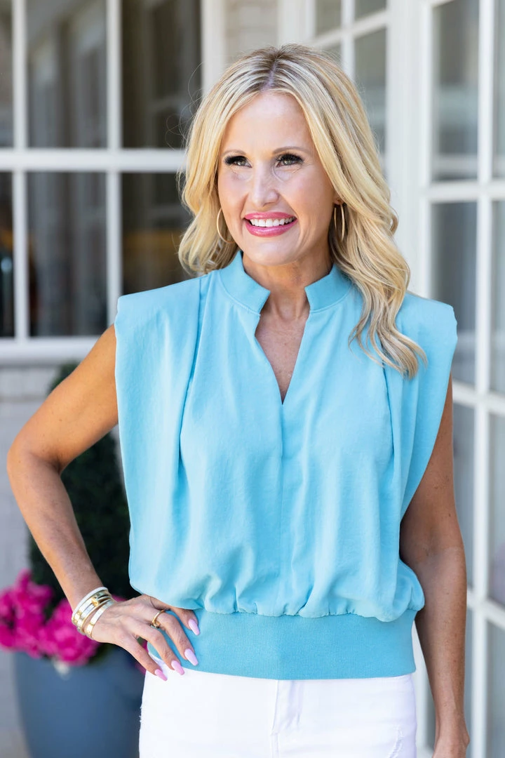 Obsessed with these details! Our Marion Top is so chic with the shoulder pads and cotton band along the collar and waist. Perfect to pair with white denim and wedges for an elevated look. Wear to your next brunch with the family or your next shopping excursion!