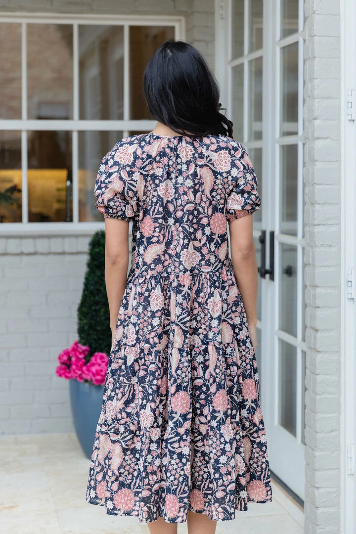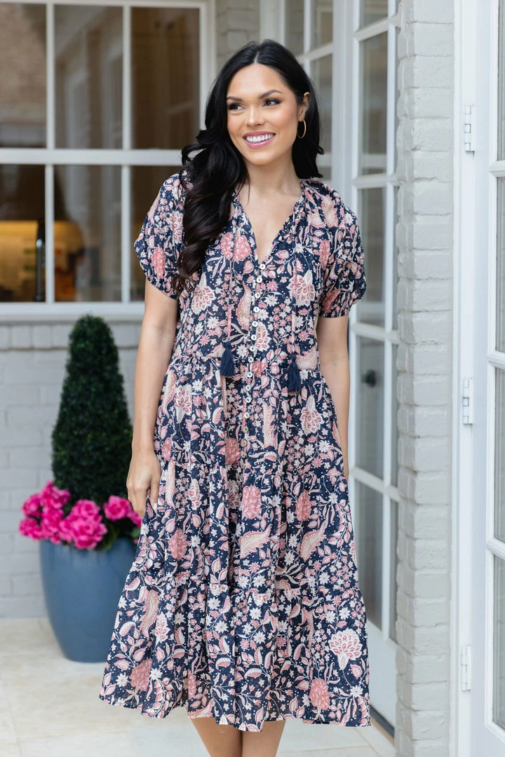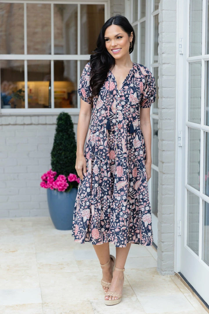 Stunner! Our Brynn Dress is a midi length completed with a tiered structure, button down enclose, tie front, and puff sleeves. A perfect option to wear for dressier evenings out, or special occasions. We love that this print can carry you through Summer and into Fall. For a more casual look pair with neutral wedges or dress it up with with strappy heels.