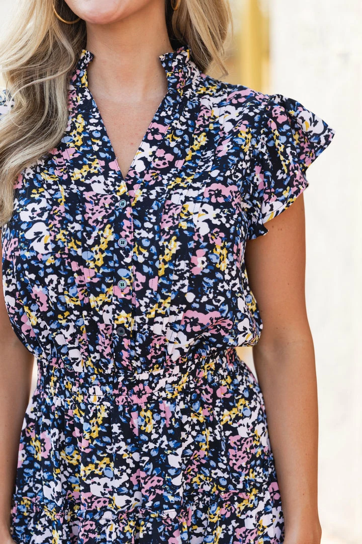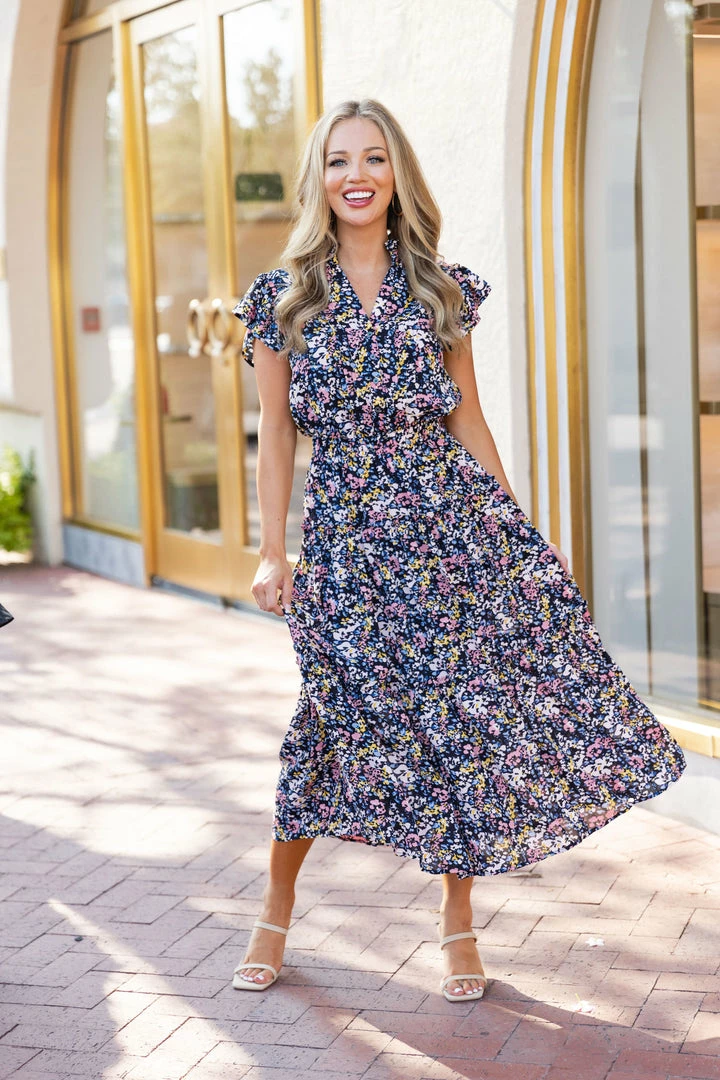 Our Charlotte Dress has it all! We love the beautiful mandarin collar and feminine yet bold floral print. Details including pleating and buttons down the bodice, flutter sleeves and the elastic waist make this an add to cart no brainer! The soft and lightweight fabric makes this dress as cute as it is comfortable for any occasion this season. Style with strappy sandals or wedges to complete the look.