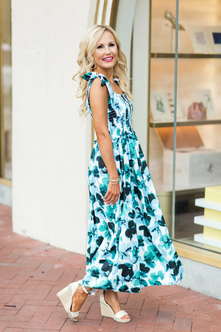 The Summer piece of your dreams! The Michelle Dress is the perfect item to keep you cool in the heat. The light material is breathable and comfortable to wear all day long. The smocked bodice stretches to fit all figures and the tie straps are extra support (and cuteness!) to keep it from falling down. We are in love with the bold floral pattern, it’s a showstopper! Pair with wedges to dress it up or sandals to dress it down.Â