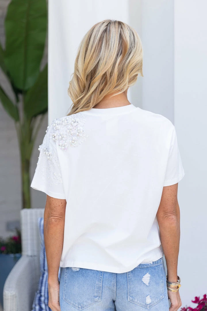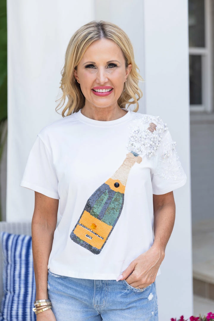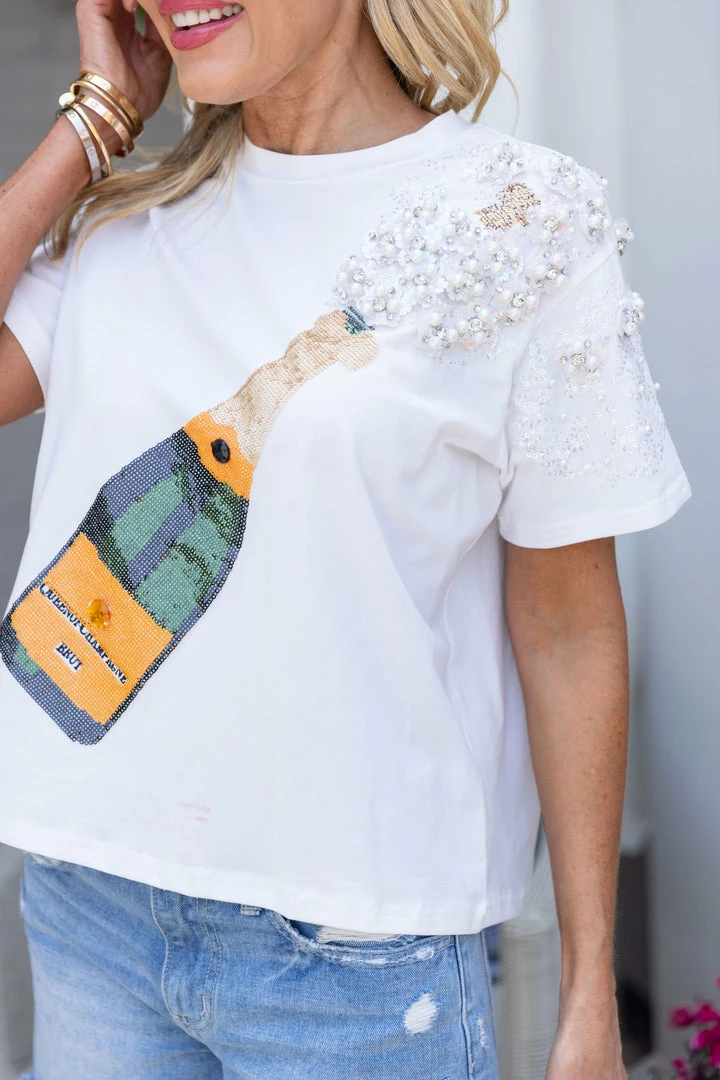 Talk about a statement piece! Our Champ Tee in White by Queen of Sparkles is so much fun and we can’t wait to wear this to our next celebratory occasion! We love the sequin champagne bottle and pearl detailing on the sleeve. Dress it up or down with your favorite denim and be ready to turn heads in this piece!