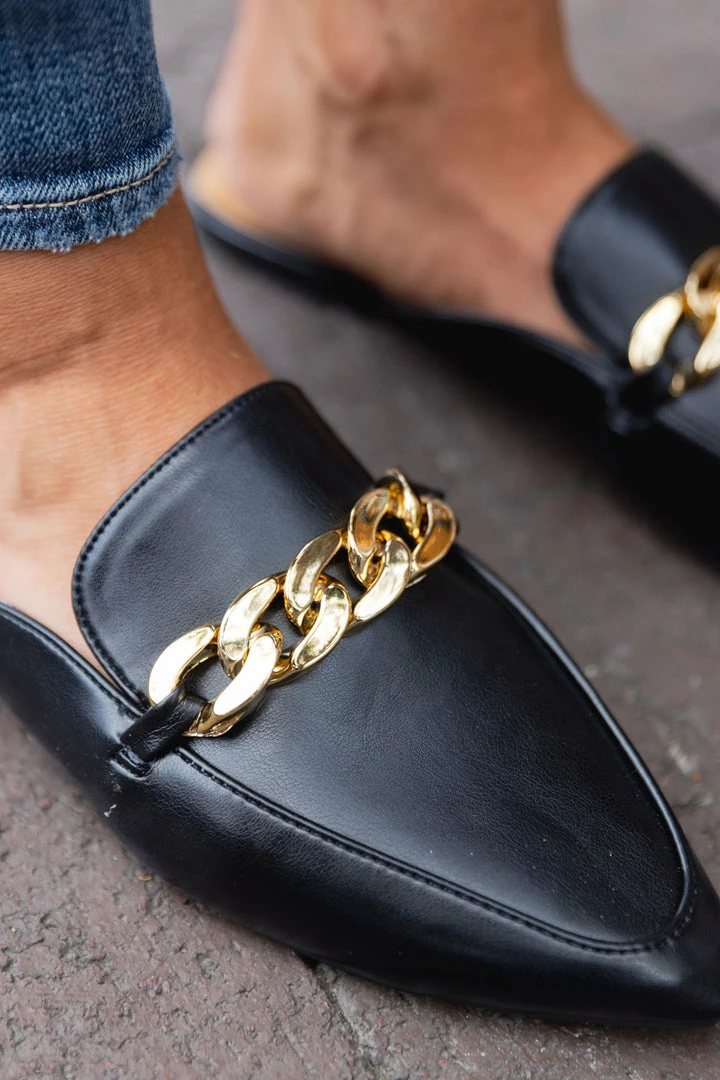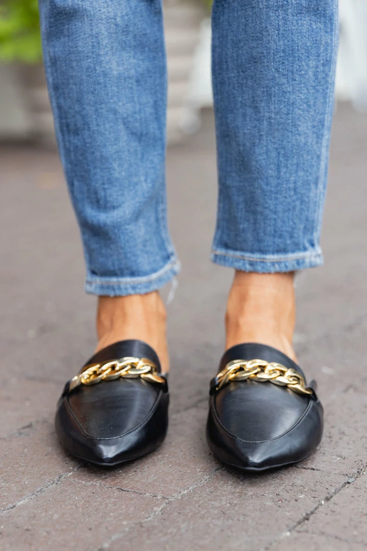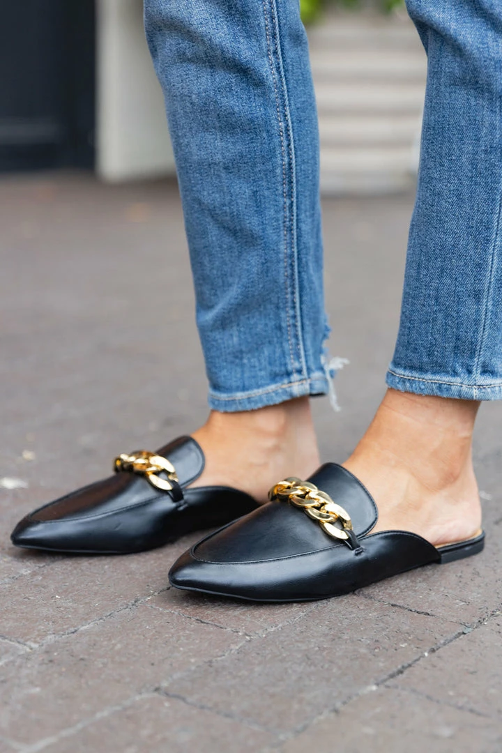Easy to wear, easy to pair! Our Jenna Mule in Black are so chic and the backless loafer style is a classic. The gold chain detailing will elevate any look, styled with jeans, dresses, or skirts. Also comes in Taupe.Â