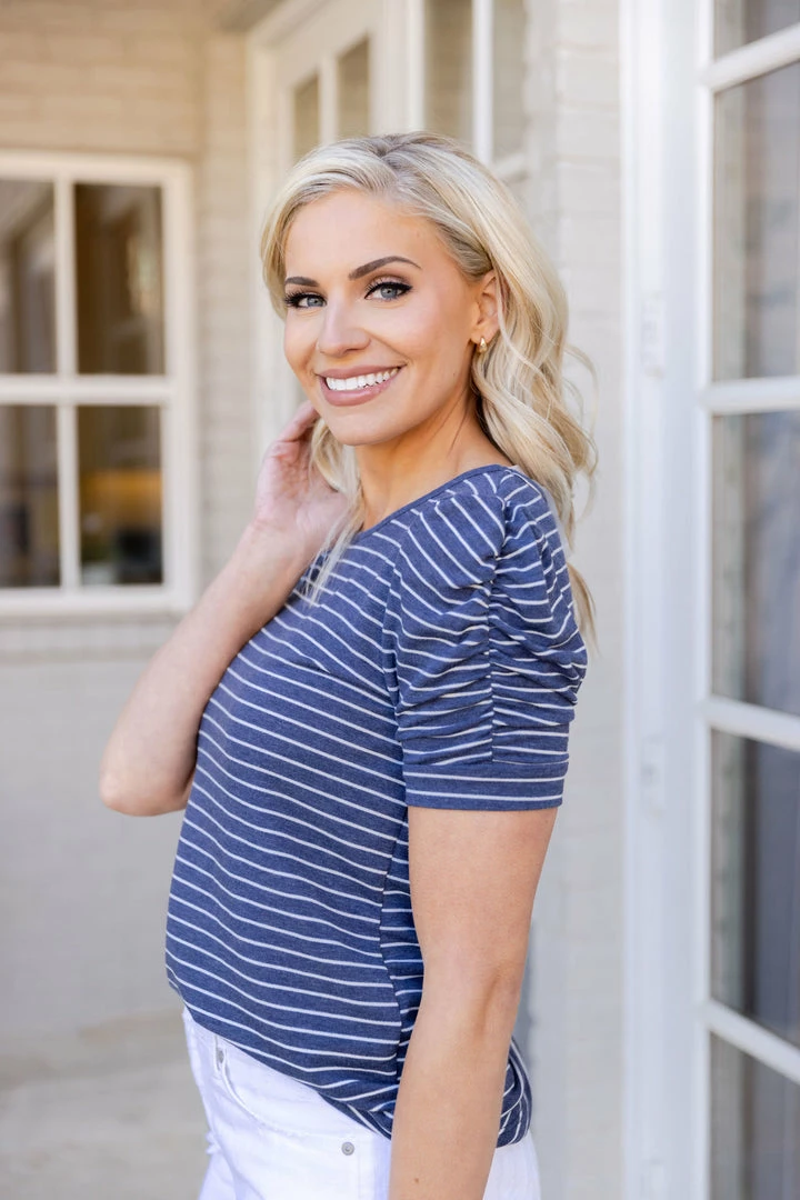 Wardrobe essential! Our super soft and lightweight Loretta Top is so versatile and the gathered ruched sleeves gives it the perfect elevated touch! For a casual and chic look pair with cutoffs or jeans and white sneakers to complete the look. Don’t miss out on this piece!