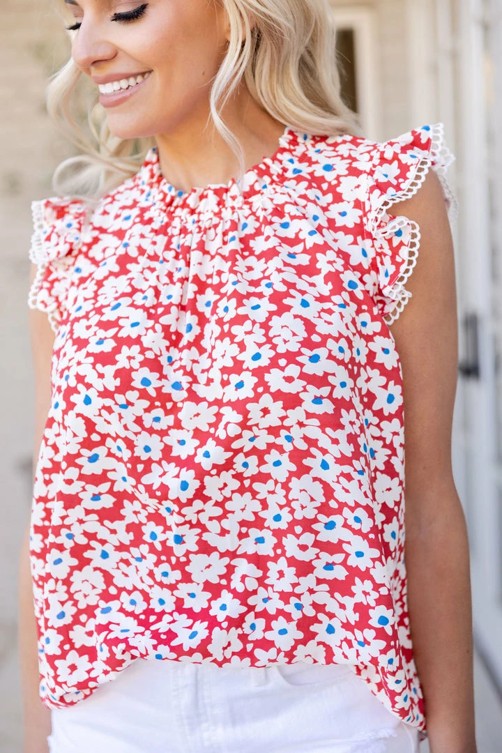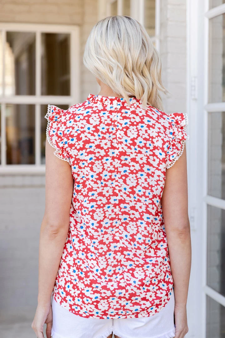 LOVE! Our Daniela Top is a beautiful piece you need in your closet! The high ruffle neckline makes for the perfect fit and the flutter sleeves with eyelet detailing adds a romantic element. The colors are so fun for the Summer and the light material lays perfectly. Pair with white denim and wedges for brunch or strappy heels for the night!