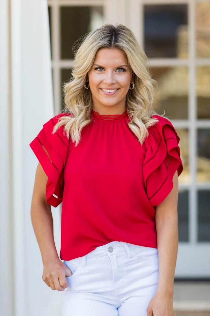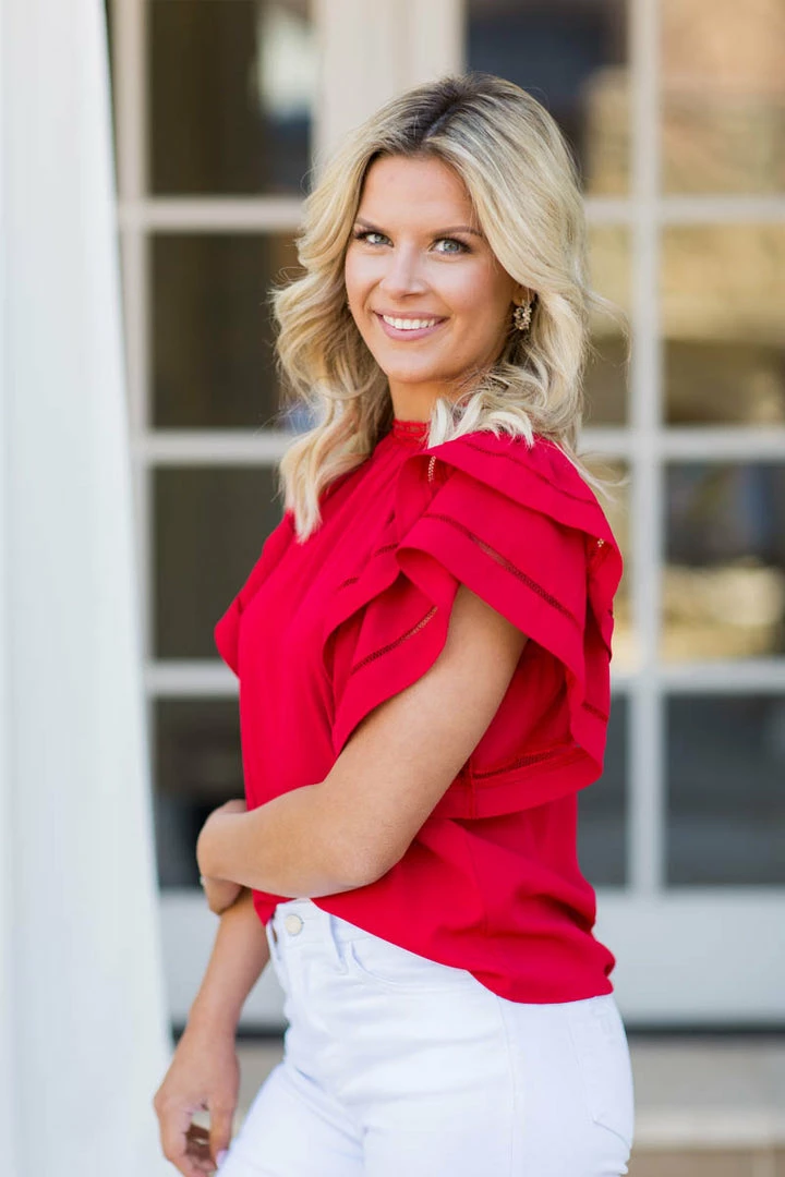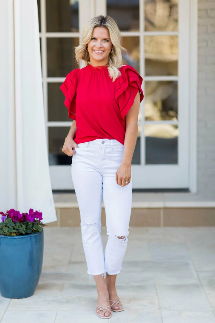 Brand bestseller! We have a feeling the Leann Top in Red is going to sell fast, so don’t wait to snag one. Made of a super soft, ultralightweight fabrication, this top has all the style elements of a bestseller – high neckline and ruffle sleeves with cutout detail. Pair with white denim shorts for a look that pops! Also comes in Pink, Aqua and Emerald.