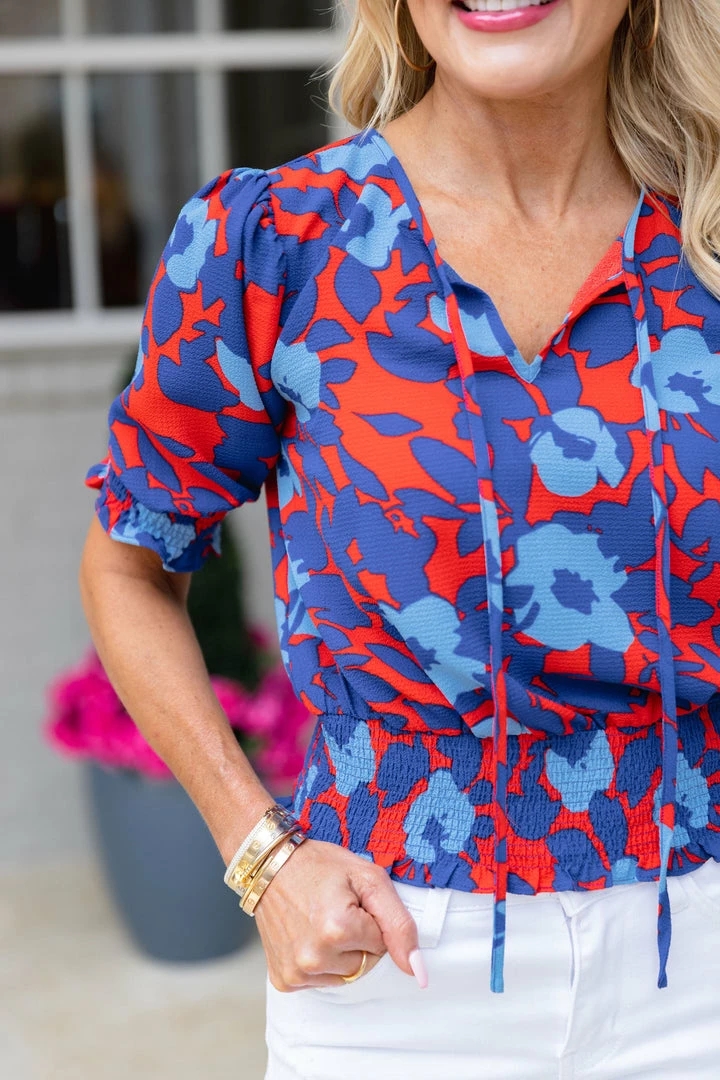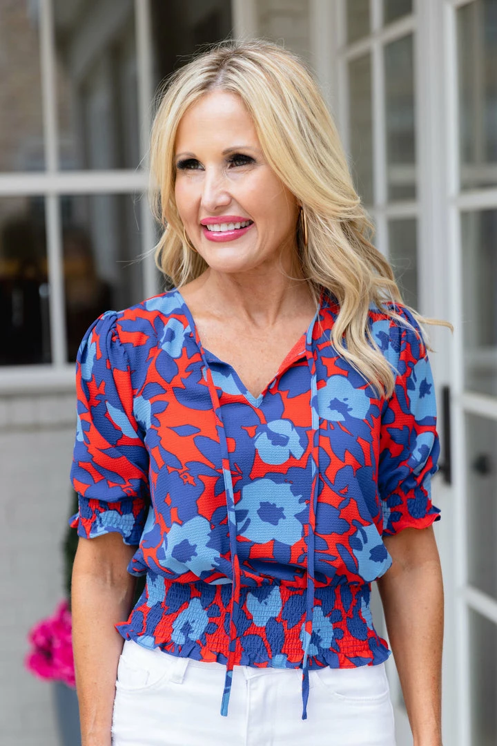 We’re obsessed with the style of this look! Our Amyra Top is so fun and unique and the color way is perfect for the Summer. This top has such great arm coverage and the smocked hemline is so flattering! Make the red and blue pop with white denim and complete the look with your favorite wedges or sandals!