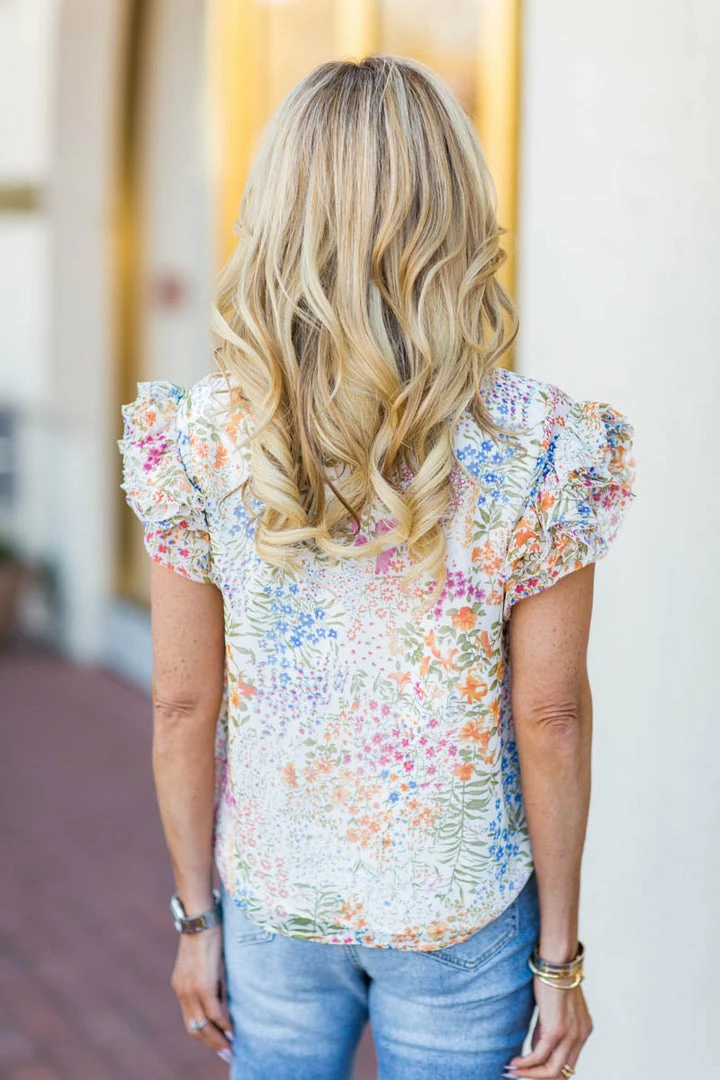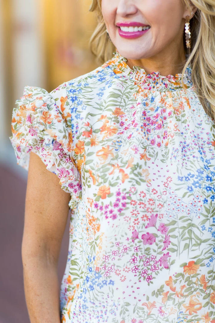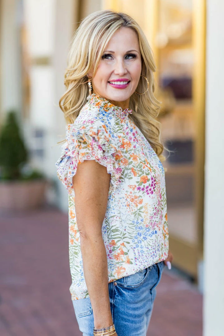 Our Aubrey Top is a floral piece like no other. We love the lightweight, blousy fabrication, unique floral design, flutter sleeves, and ruffled high neck. Wear this on all your future vacations, school functions, luncheons etc, you will be receiving compliments left and right. Pair with white denim and a colorful purse for a fun look.