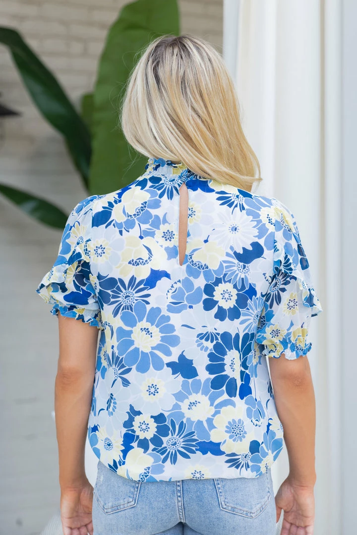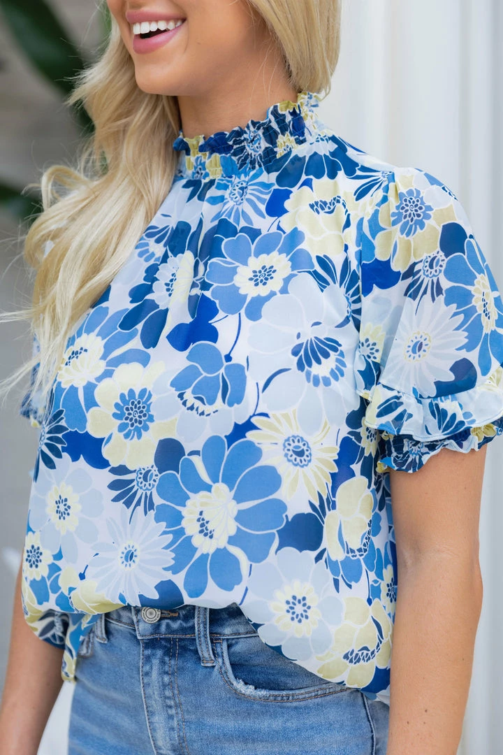 Flower power! Our Chrisley Top is bound to become a wear-on-repeat favorite! The on-trend blue and yellow mod-floral print adds a pop of color for Summer and we love the elevated higher neckline and puff sleeves. Pair with lightwash or white denim or give the piece a classic look with white shorts and your favorite neutral wedges.