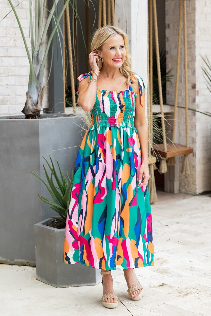 We can’t wait to wear this on our next vacation! Our Walker Dress is so fun with the multicolor, abstract print and details like the smocked bodice and adjustable tie straps! Keep cool with the lightweight and flowy fabrication of this maxi and pair with wedges or sandals to elevate your look.