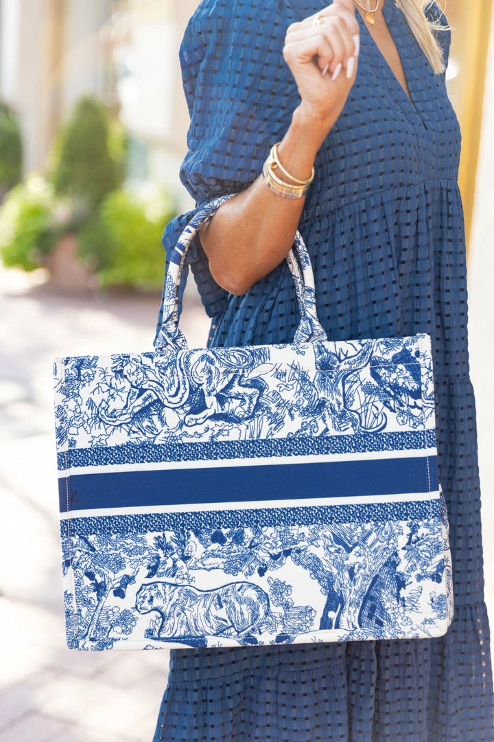 Designer inspired! Our Chandra Tote in Blue is a structured but stylish bag for the woman on the go. Whether you’re going to brunch with the girls or picking up your kids from school, this tote is the one! With its versatile look, dress this bag up or down for any occasion. Also comes in Orange.Â