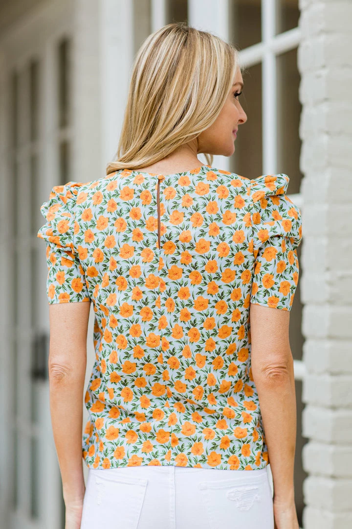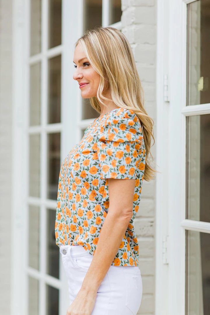 Brand bestseller! The Corrine Top is Spring perfection. The blue background with yellow/orange floral is so fun and the ultra soft, lightweight fabric is cool and comfortable. We love the puff sleeves with the arm coverage! Pair with your favorite Avara denim or white jeans for the cutest look! Don’t snooze on this one, as there’s no restock.Â