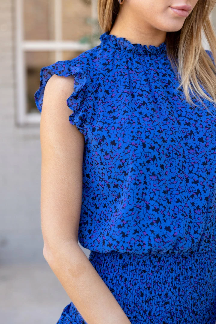 Stand out in this pop of blue! Our Cheryl Dress is a lightweight fabrication with a floral smocked waistband and ruffled sleeves. This piece will be your new go to party look! Pair with neutral heels or wedges for a look that will make you shine!